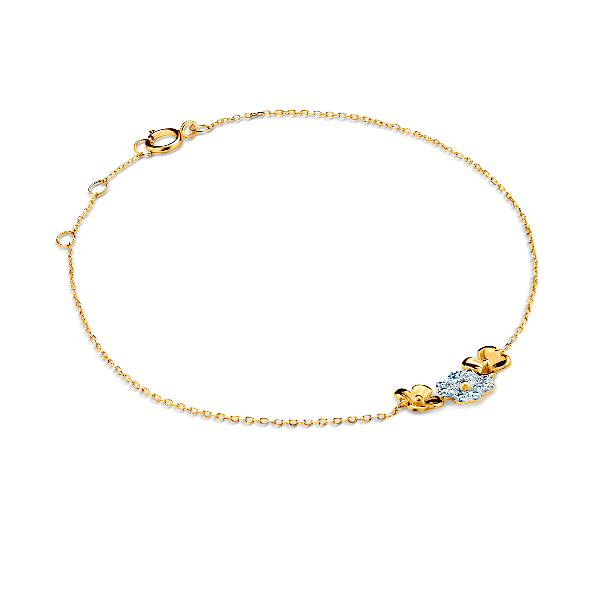 Bransoletka Savicki wykonana z żółtego złota (próba 585). W bransoletce osadzono 4 diamenty o łącznej masie 0,01 CT i szlifie brylantowym.
