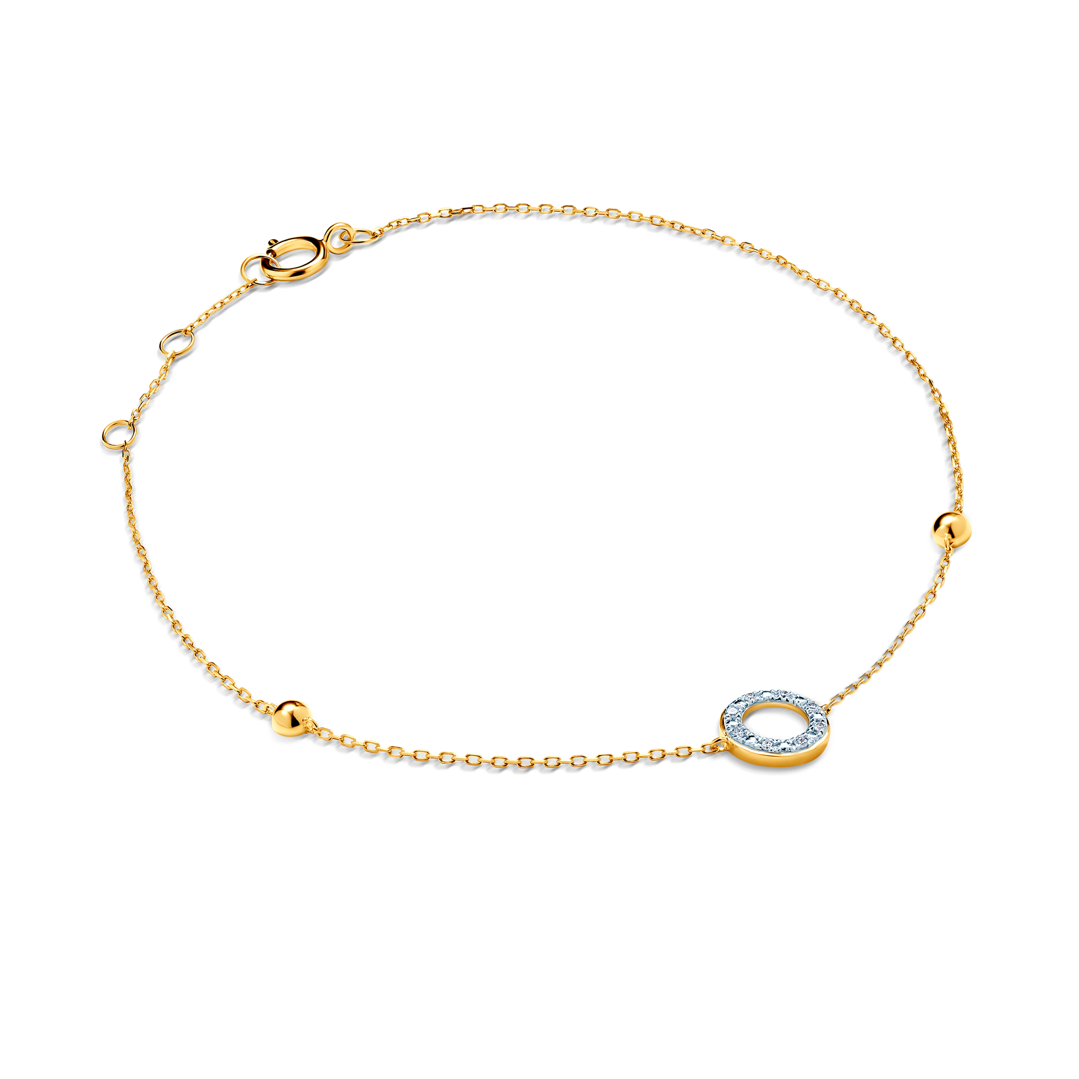Bransoletka koło Savicki wykonana z żółtego złota (próba 585). W bransoletce osadzono 8 diamentów o łącznej masie 0,02 CT i szlifie brylantowym.