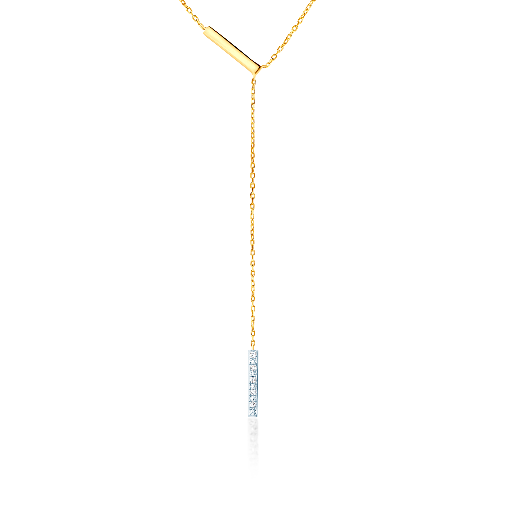 W naszyjniku zostało osadzone 5 diamenty o łącznej masie 0,01 ct. Naszyjnik wykonany z żółtego złota (próba 585).