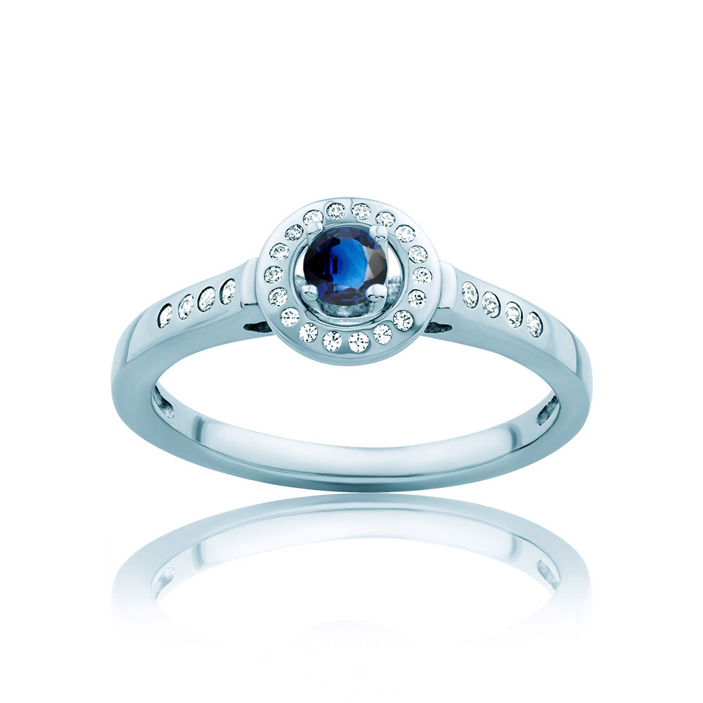 Pierścionek z niebieskim szafirem oraz 26 diamentami o szlifie brylantowym wysokiej czystości SI/H, o łącznej masie 0,24 ct. Wykonany z 14-karatowego białego złota (próba 0,585).