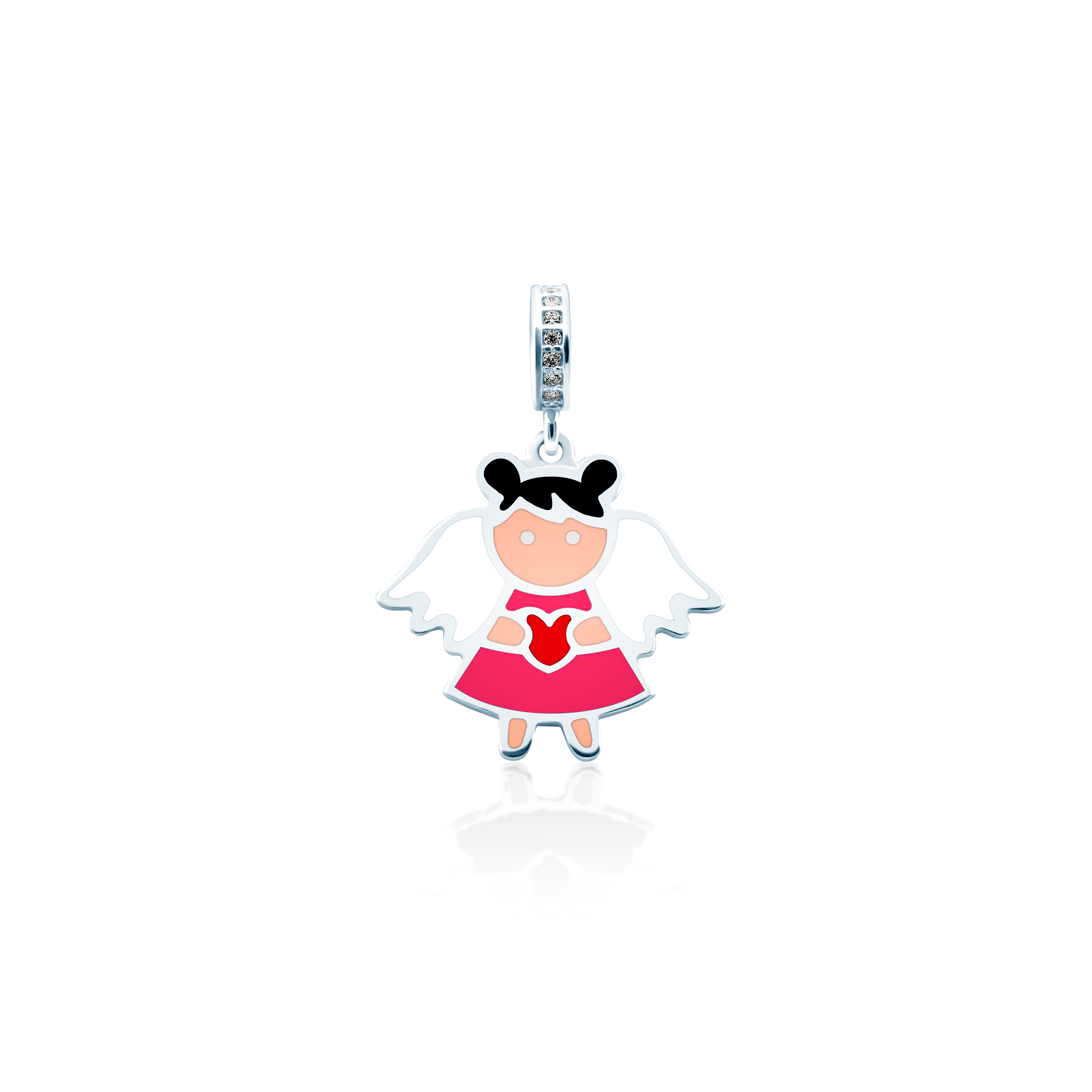 Zawieszka anioł wykonana ze srebra próby 925. W zawieszce zostały osadzone cyrkonie.
