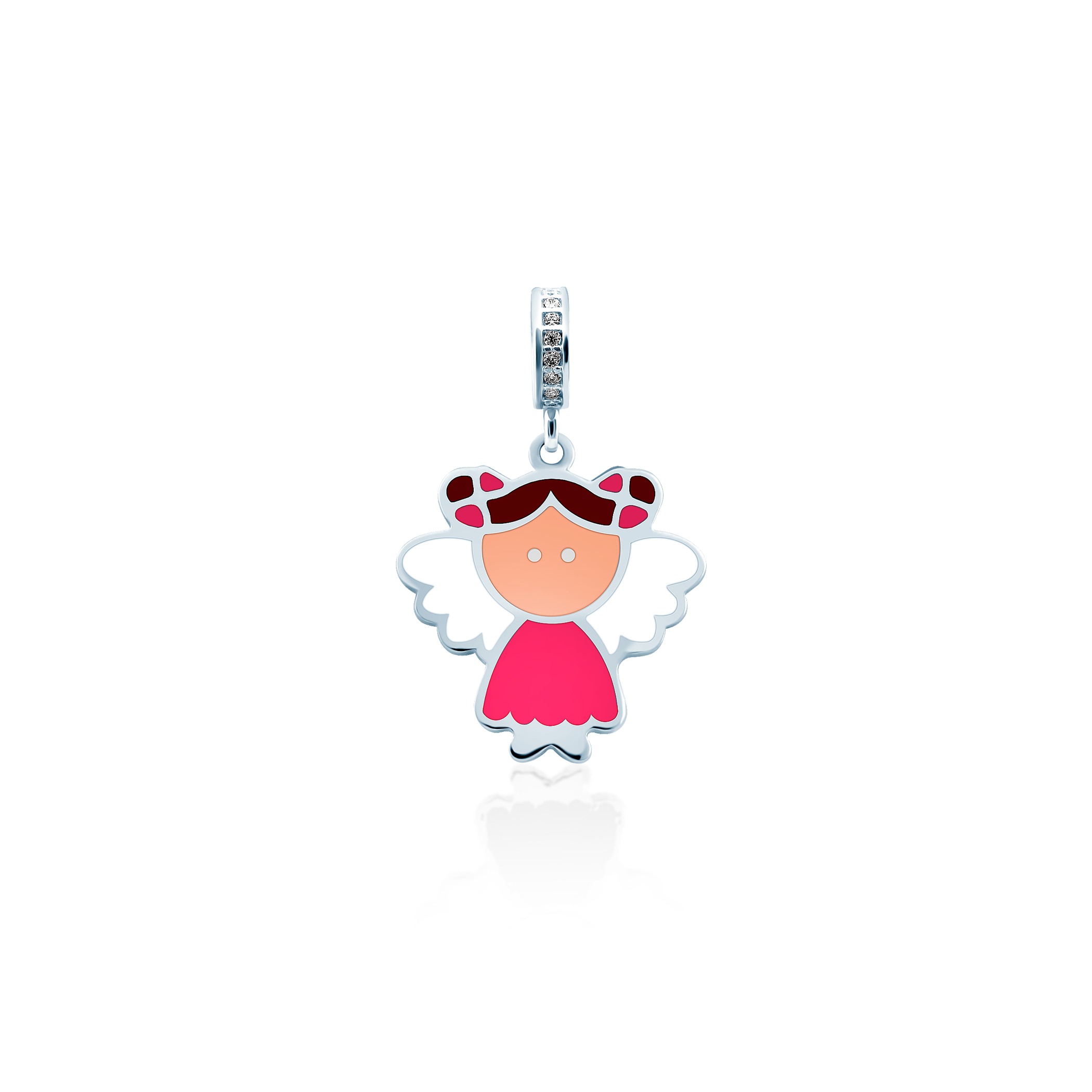 Zawieszka anioł wykonana ze srebra próby 925. W zawieszce zostały osadzone cyrkonie.