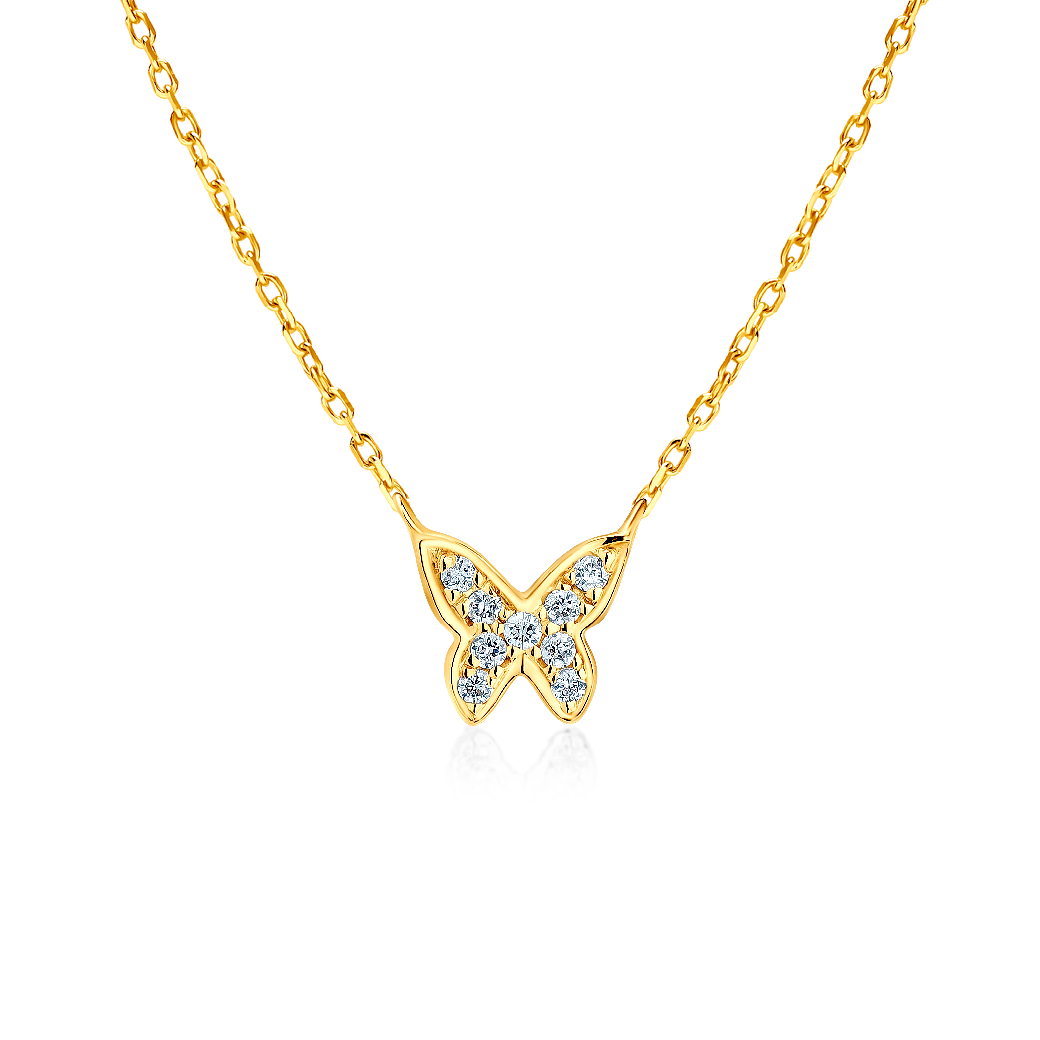 Naszyjnik motyl Savicki wykonany z żółtego złota (próba 375). W naszyjniku zostało osadzonych 9 diamentów o łącznej masie 0,02 ct.