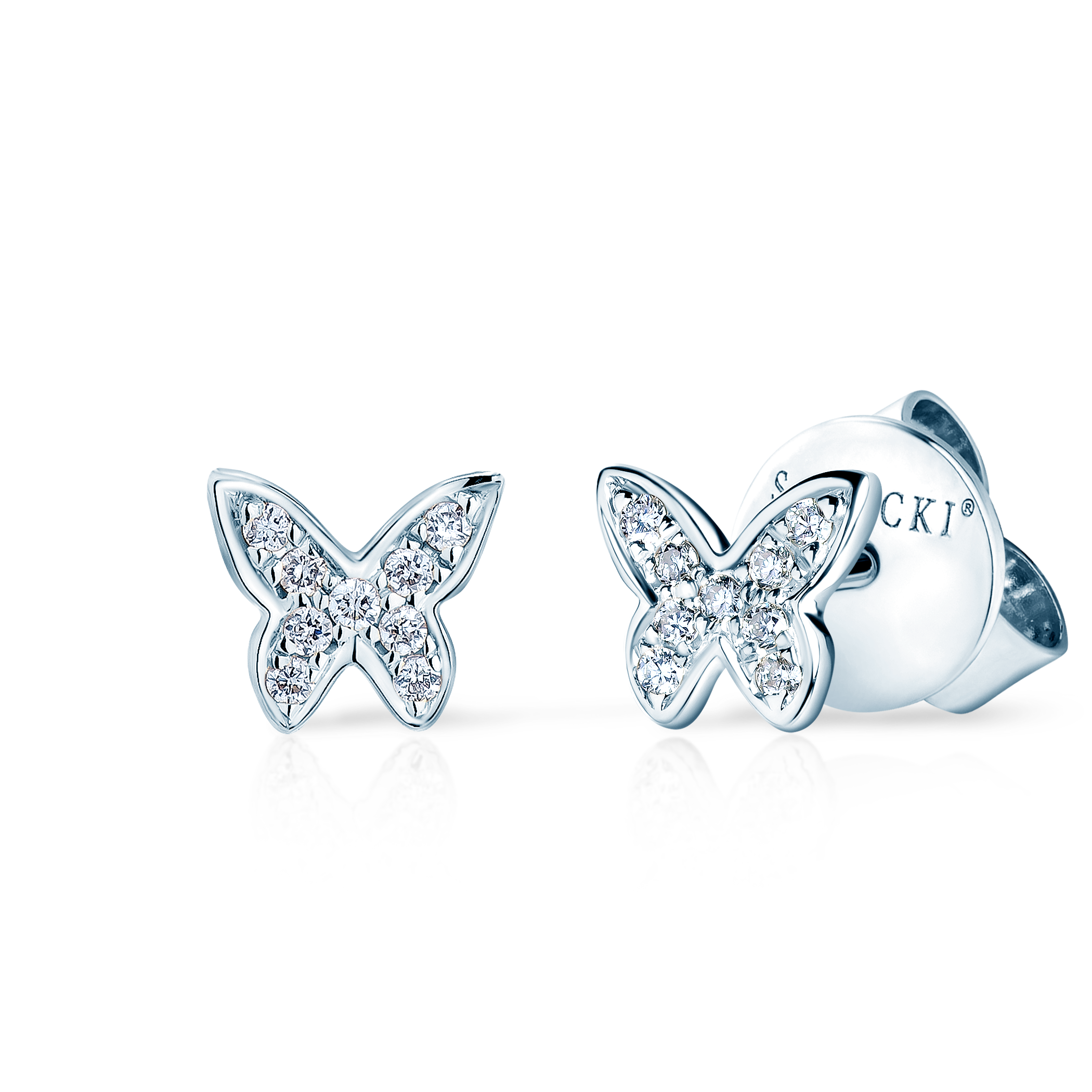 Kolczyki motyle Savicki wykonane z białego złota (próba 375). W kolczykach zostało osadzonych 18 diamentów o łącznej masie 0,05 ct. Kolczyki posiadają blokadę, która zabezpiecza zapięcie przed zsunięciem się.