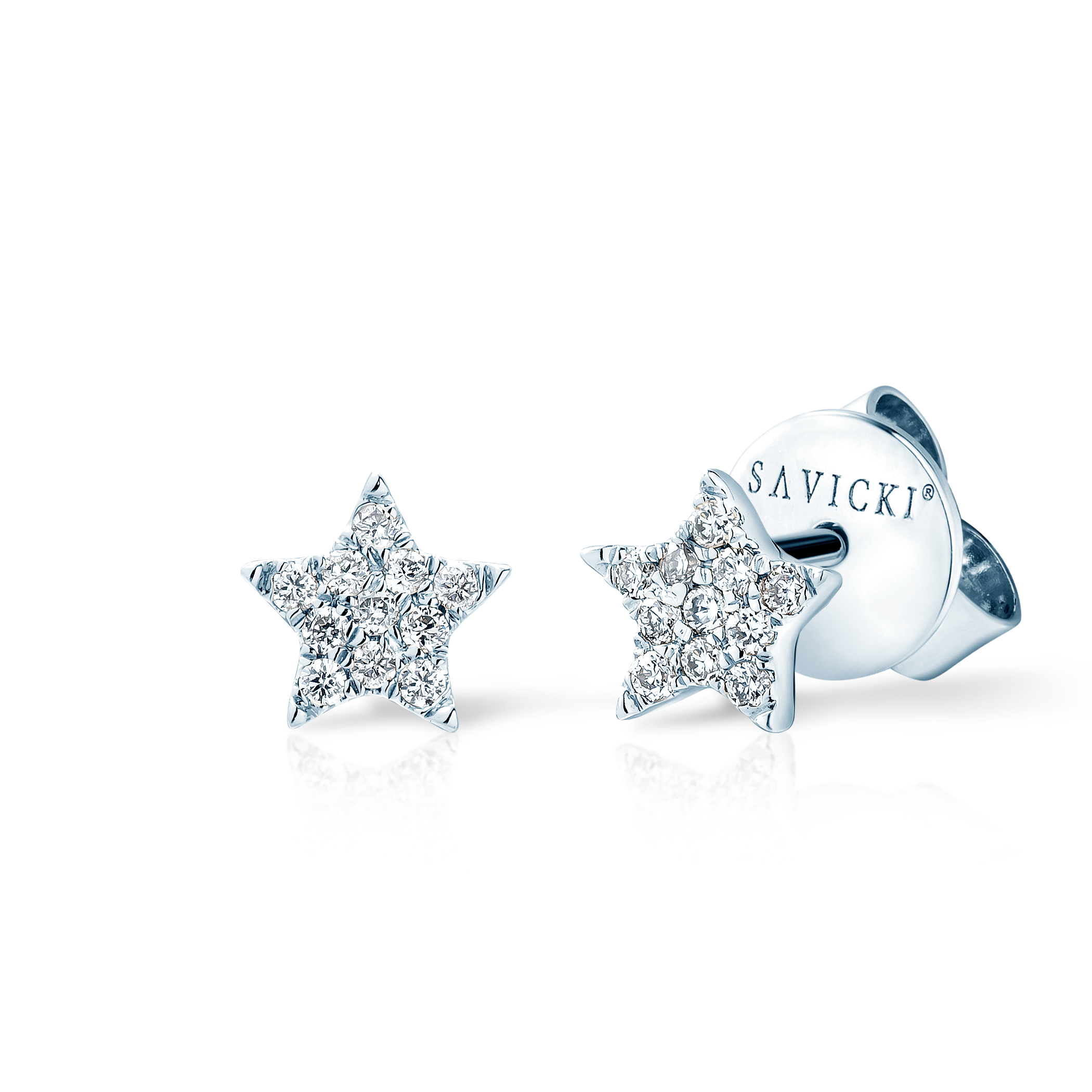 Kolczyki gwiazdy Savicki wykonane z białego złota (próba 375). W kolczykach zostały osadzone 22 diamenty o łącznej masie 0,05 ct. Kolczyki posiadają blokadę, która zabezpiecza zapięcie przed zsunięciem się.