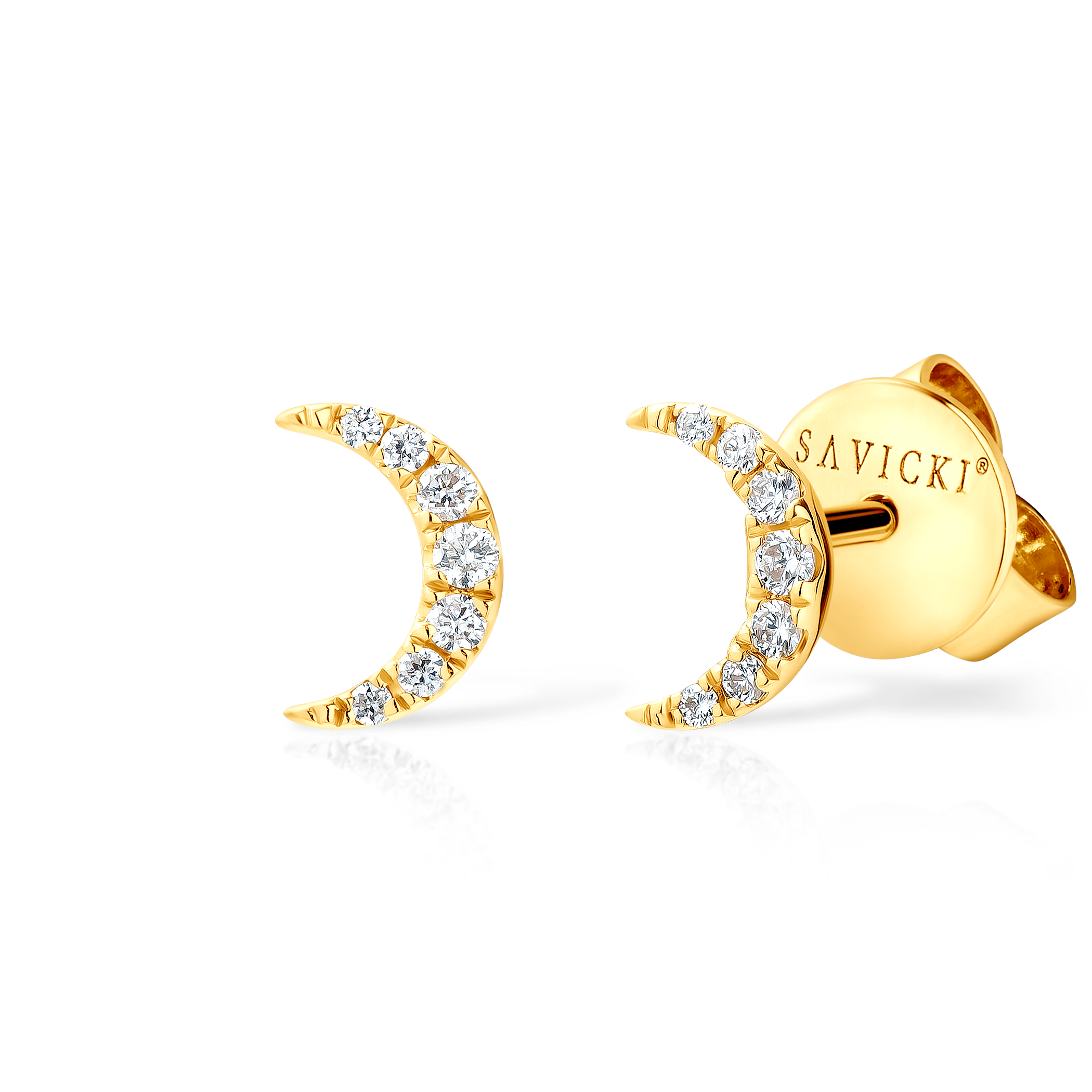 Kolczyki księżyce Savicki wykonane z żółtego złota (próba 375). W kolczykach zostało osadzonych 14 diamentów o łącznej masie 0,06 ct. Kolczyki posiadają blokadę, która zabezpiecza zapięcie przed zsunięciem się.