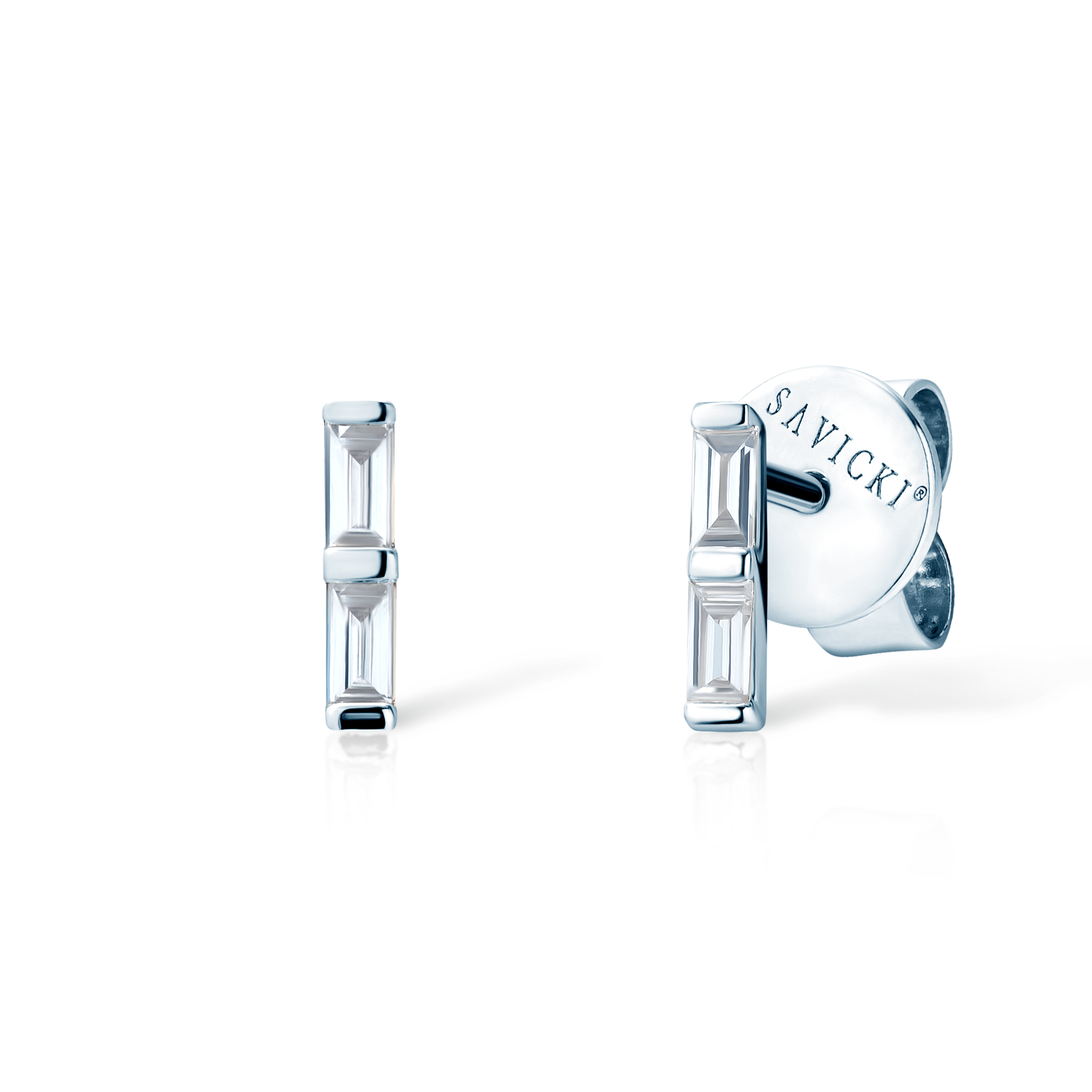 Kolczyki Savicki wykonane z białego złota (próba 375). W kolczykach zostały osadzone 4 diamenty o łącznej masie 0,09 ct. Kolczyki posiadają blokadę, która zabezpiecza zapięcie przed zsunięciem się.