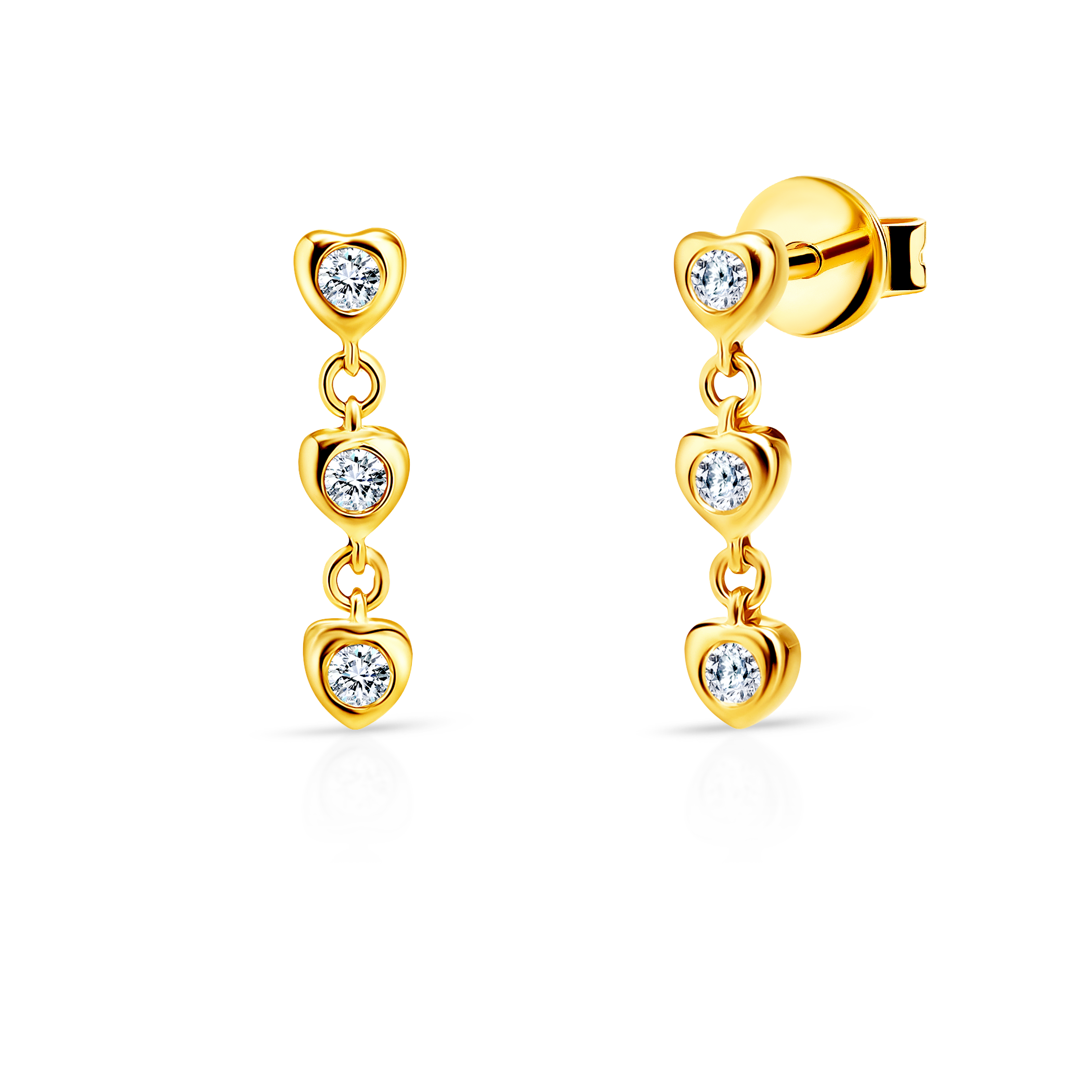Kolczyki serca wykonane z żółtego złota (próba 375). W kolczykach zostało osadzonych 6 diamentów o łącznej masie 0,09 ct. Kolczyki posiadają blokadę, która zabezpiecza zapięcie przed zsunięciem się.