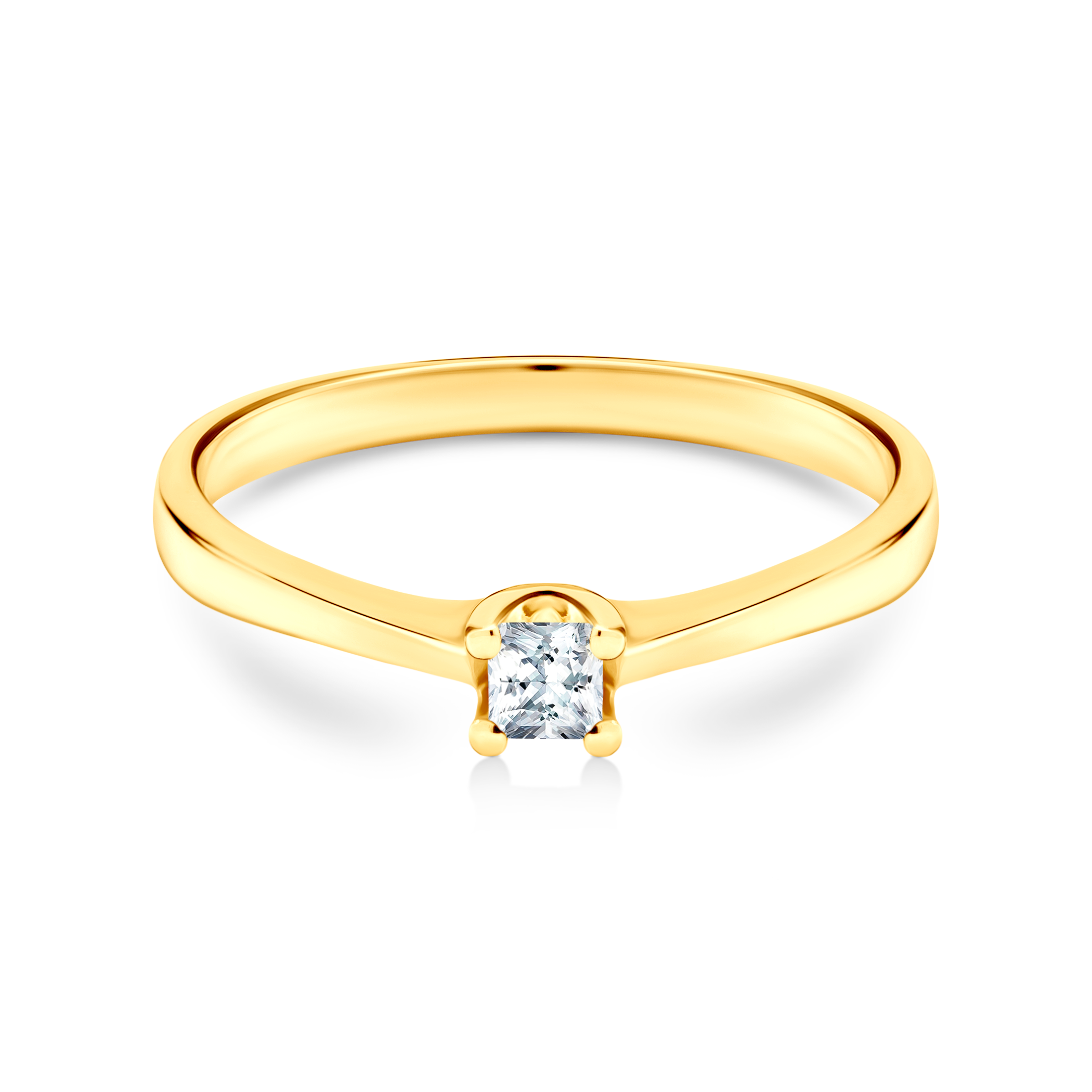 Pierścionek zaręczynowy z diamentem 0,1 ct o szlifie princessa wysokiej czystości SI2/H, wykonany z 14-karatowego żółtego złota (próba 0,585).