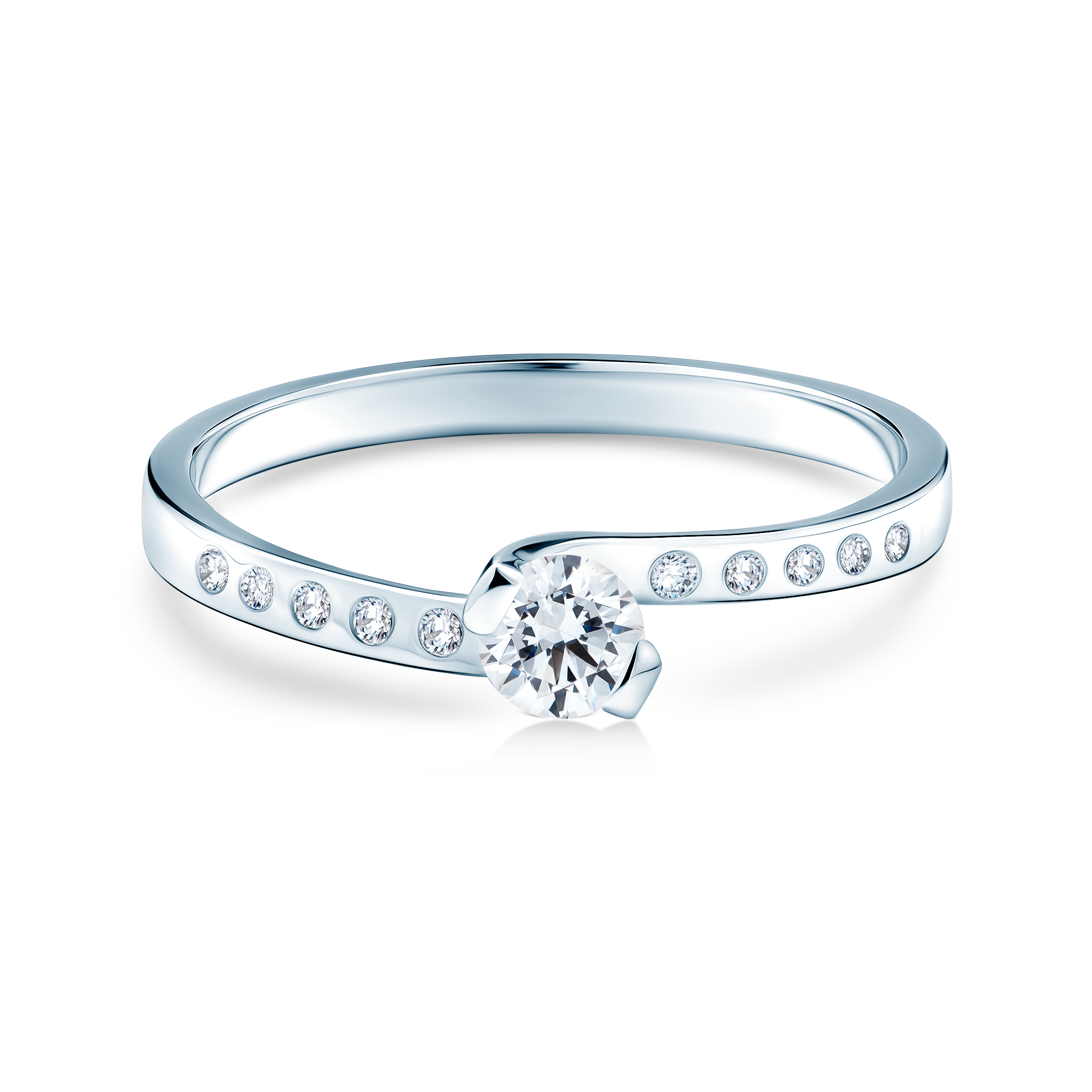Pierścionek zaręczynowy z diamentem 0,2 ct o szlifie brylantowym wysokiej czystości SI2/H oraz kamieniami w szynie 10x0,005ct SI2/H, wykonany z 14-karatowego białego złota (próba 0,585).