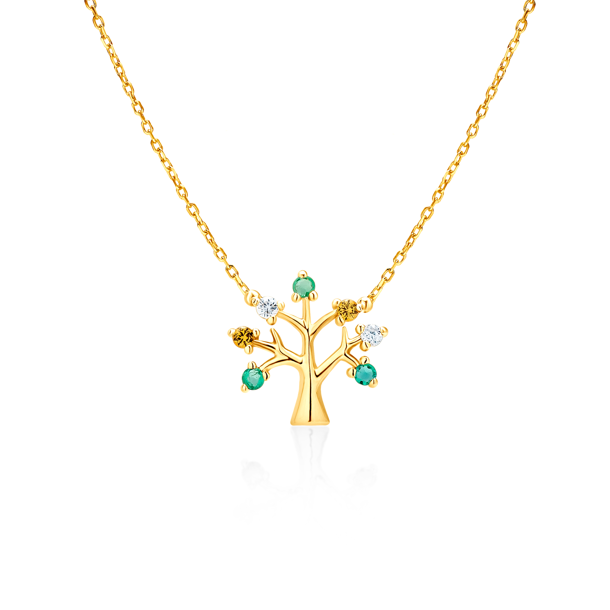 Naszyjnik drzewo Savicki wykonany z żółtego złota (próba 585). W naszyjniku zostały osadzone 2 diamenty o łącznej masie 0,04 ct, 2 żółte szafiry o łącznej masie 0,04 ct oraz 3 szmaragdy o łącznej masie 0,06 ct.