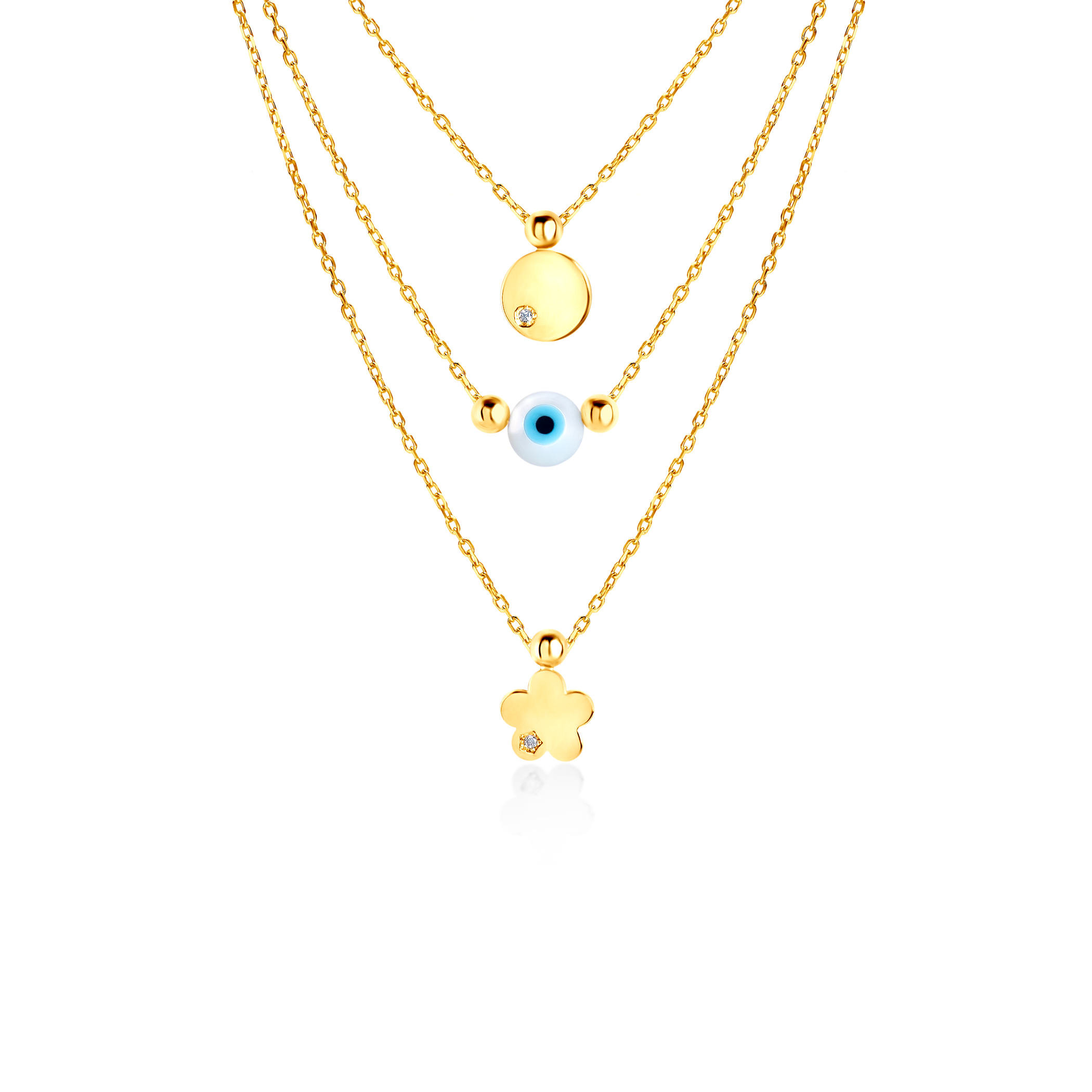 Naszyjnik koło, oko, kwiat Savicki wykonany z żółtego złota (próba 585). W naszyjniku zostały osadzone 2 diamenty o łącznej masie 0,02 ct.