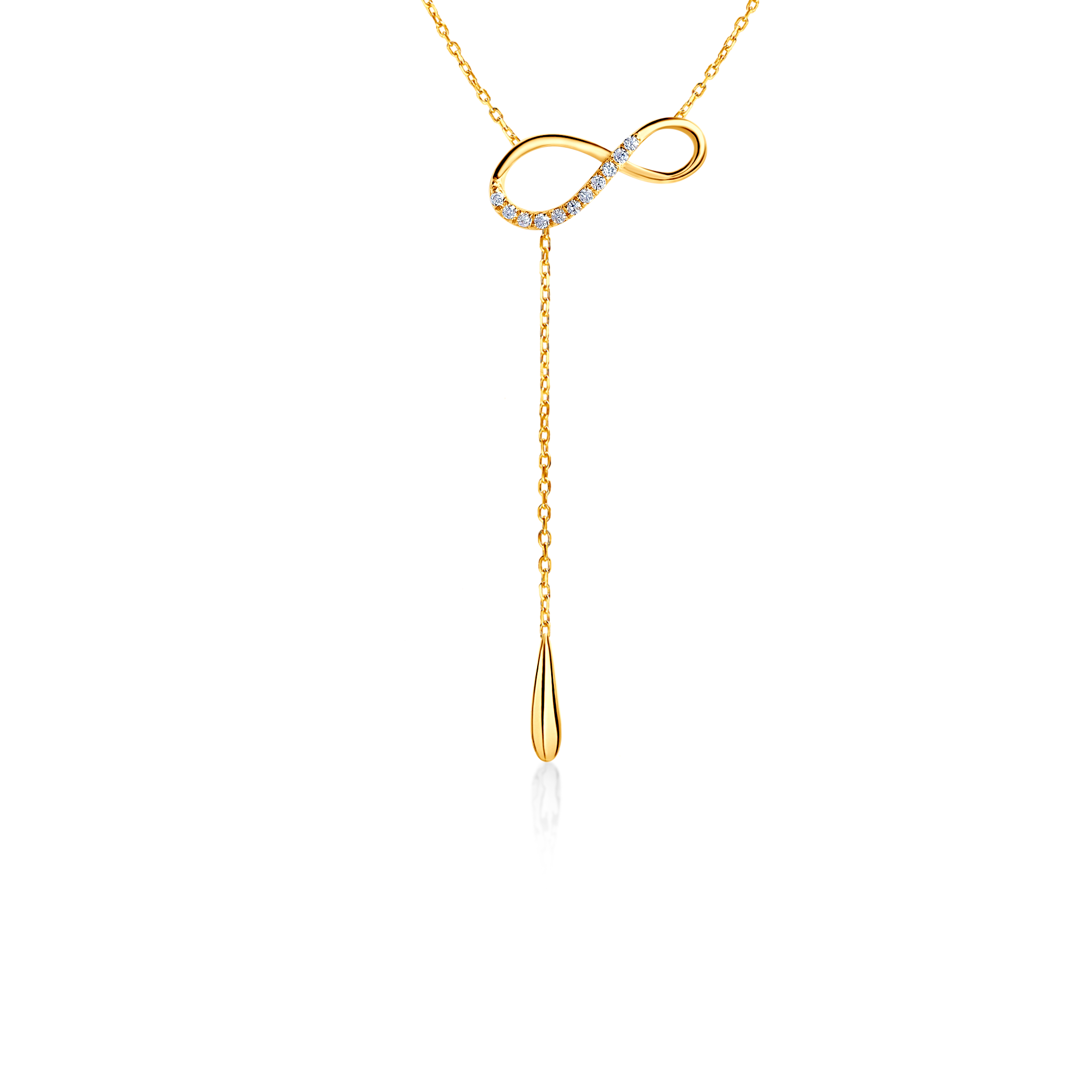Naszyjnik nieskończoność Savicki wykonany z żółtego złota (próba 585). W naszyjniku zostało osadzonych 11 diamentów o łącznej masie 0,05 ct.