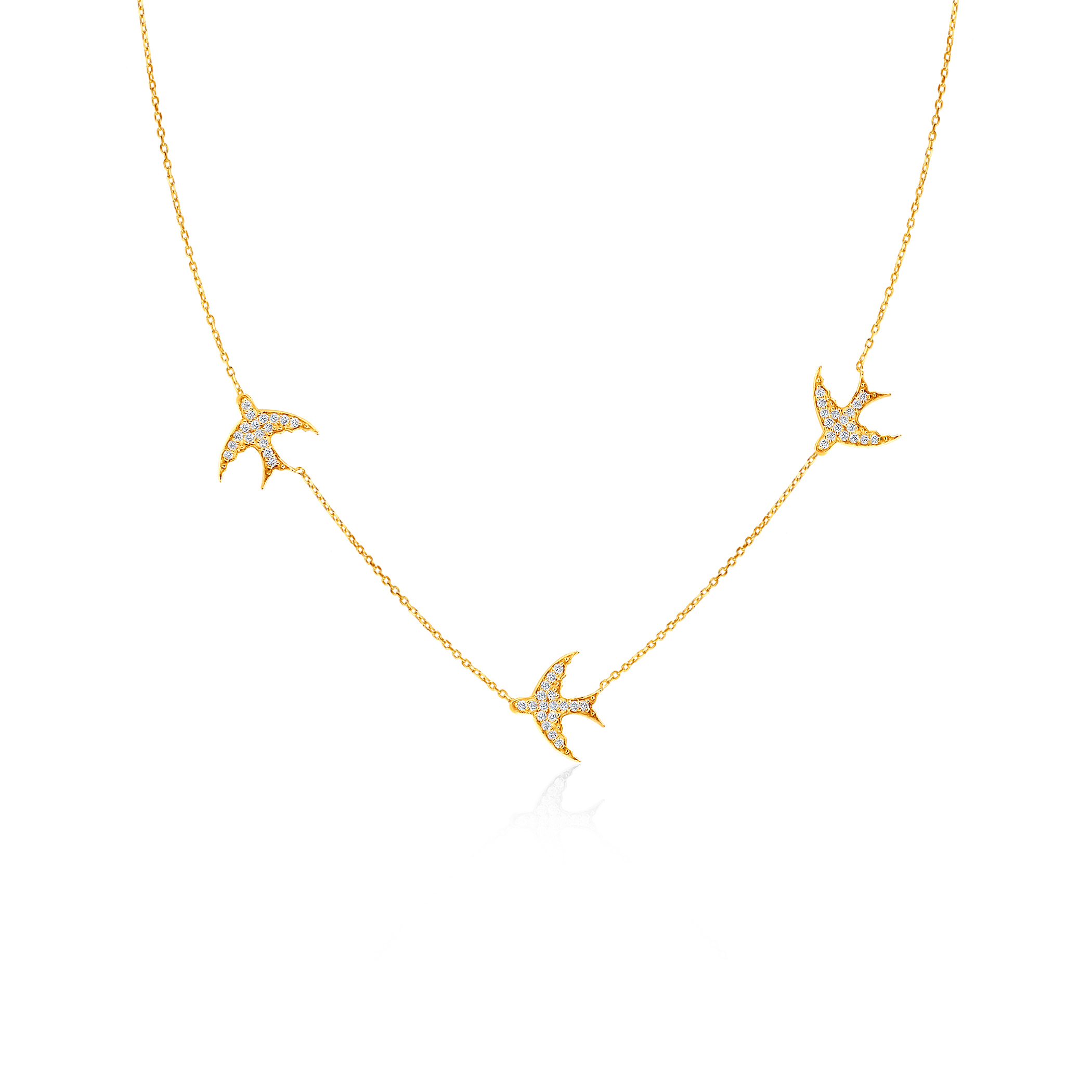 Naszyjnik jaskółki Savicki wykonany z żółtego złota (próba 585). W naszyjniku zostało osadzonych 51 diamentów o łącznej masie 0,33 ct.