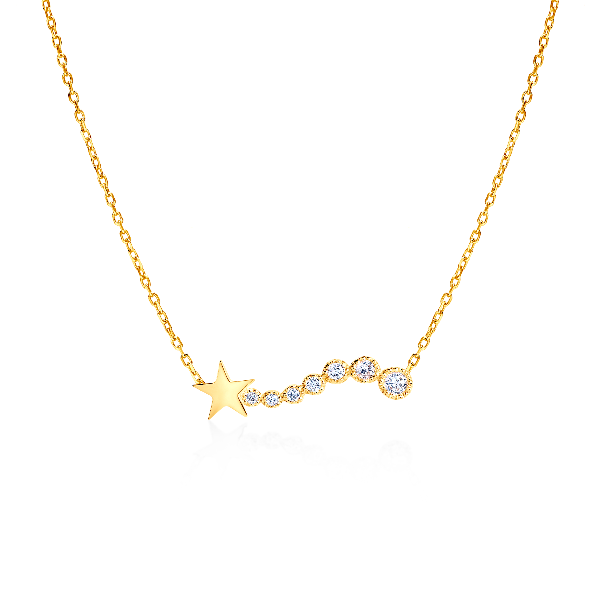 Naszyjnik gwiazdka Savicki wykonany z żółtego złota (próba 585). W naszyjniku zostało osadzonych 7 diamentów o łącznej masie 0,15 ct.