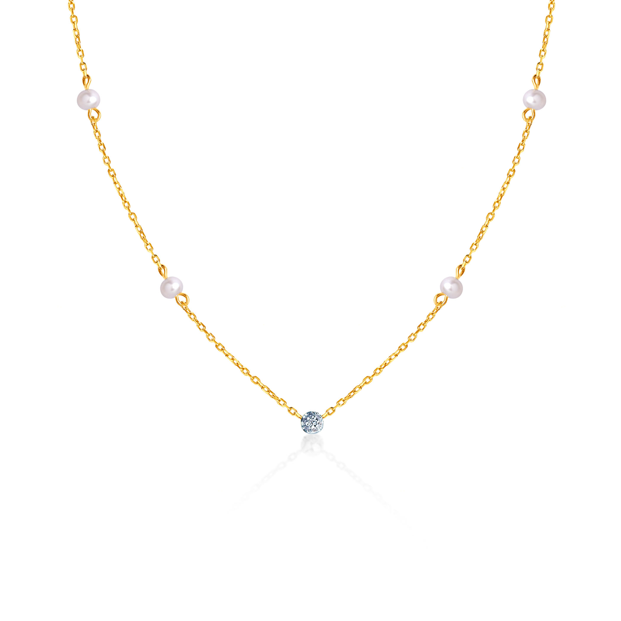 W naszyjniku zostało osadzonych 6 pereł i 7 diamentów o łącznej masie 0,02 ct i szlifie brylantowym. Naszyjnik wykonany z połączenia żółtego i białego złota (próba 585).