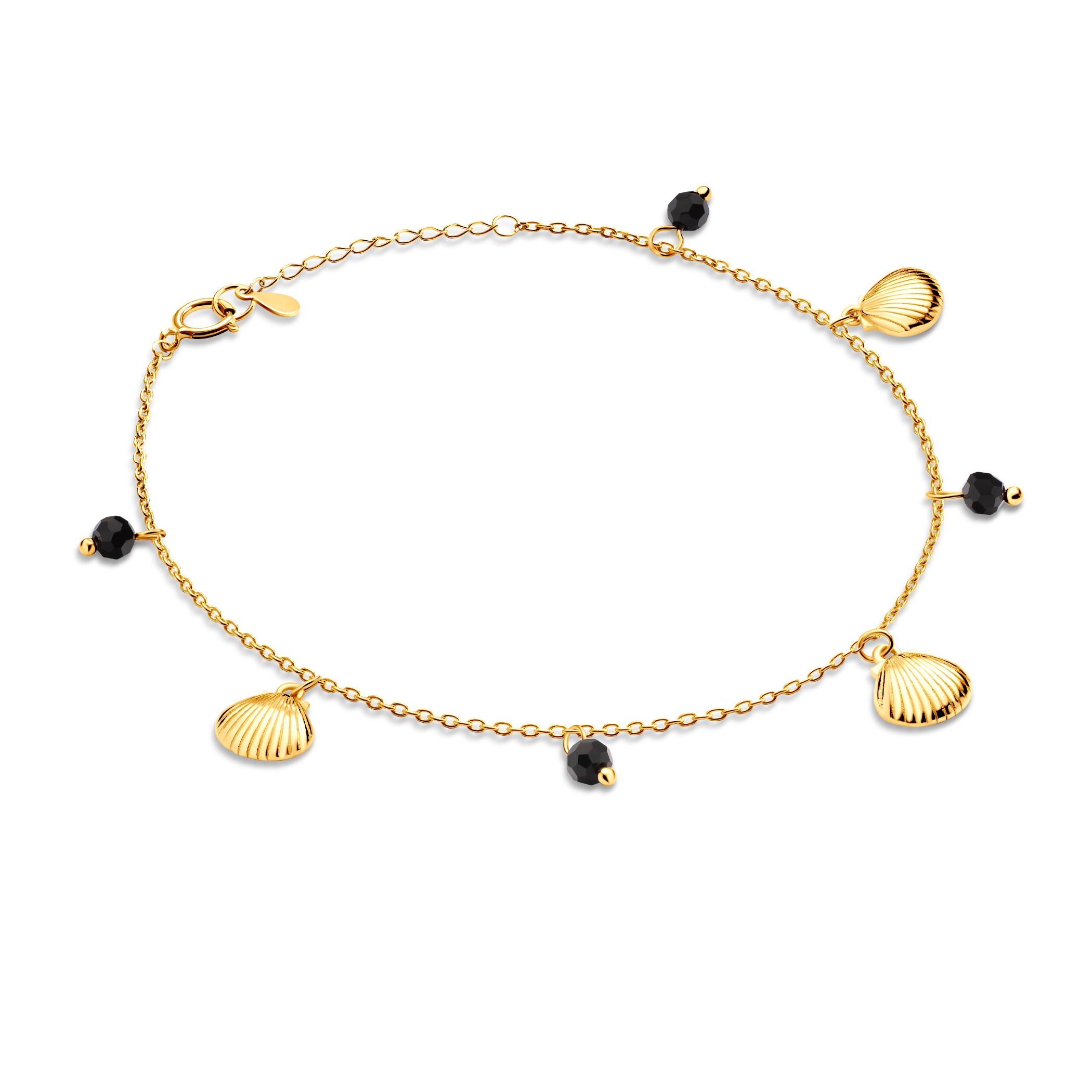 Bransoletka na nogę z muszelkami Savicki wykonana ze srebra (próba 925) pozłacana żółtym złotem. W bransoletce zostały osadzone spinele.