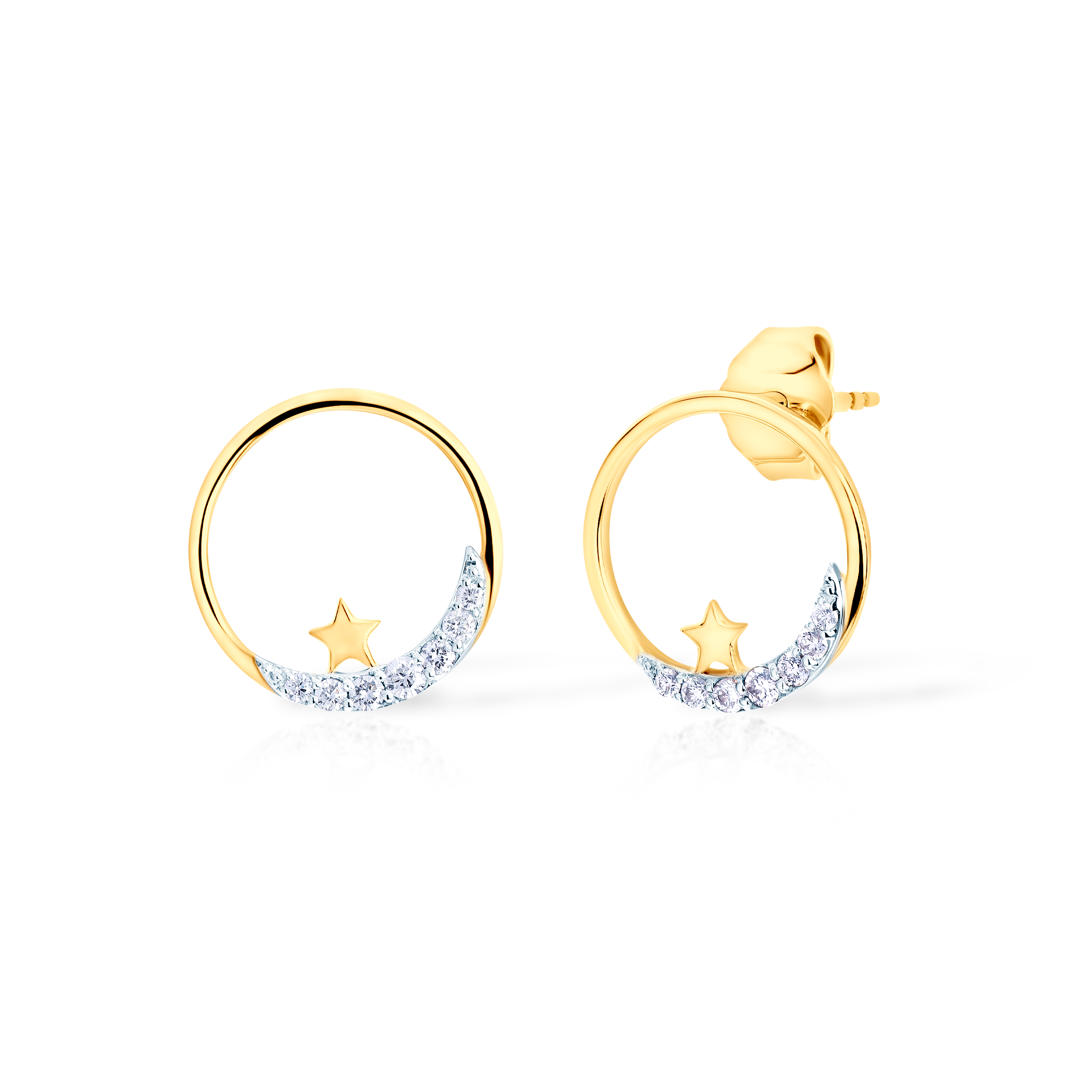 Kolczyki koła, gwiazdki, księżyce Savicki wykonane żółtego złota (próba 375). W kolczykach zostało osadzonych 14 diamentów o łącznej masie 0,13 ct. Kolczyki posiadają blokadę, która zabezpiecza zapięcie przed zsunięciem się.