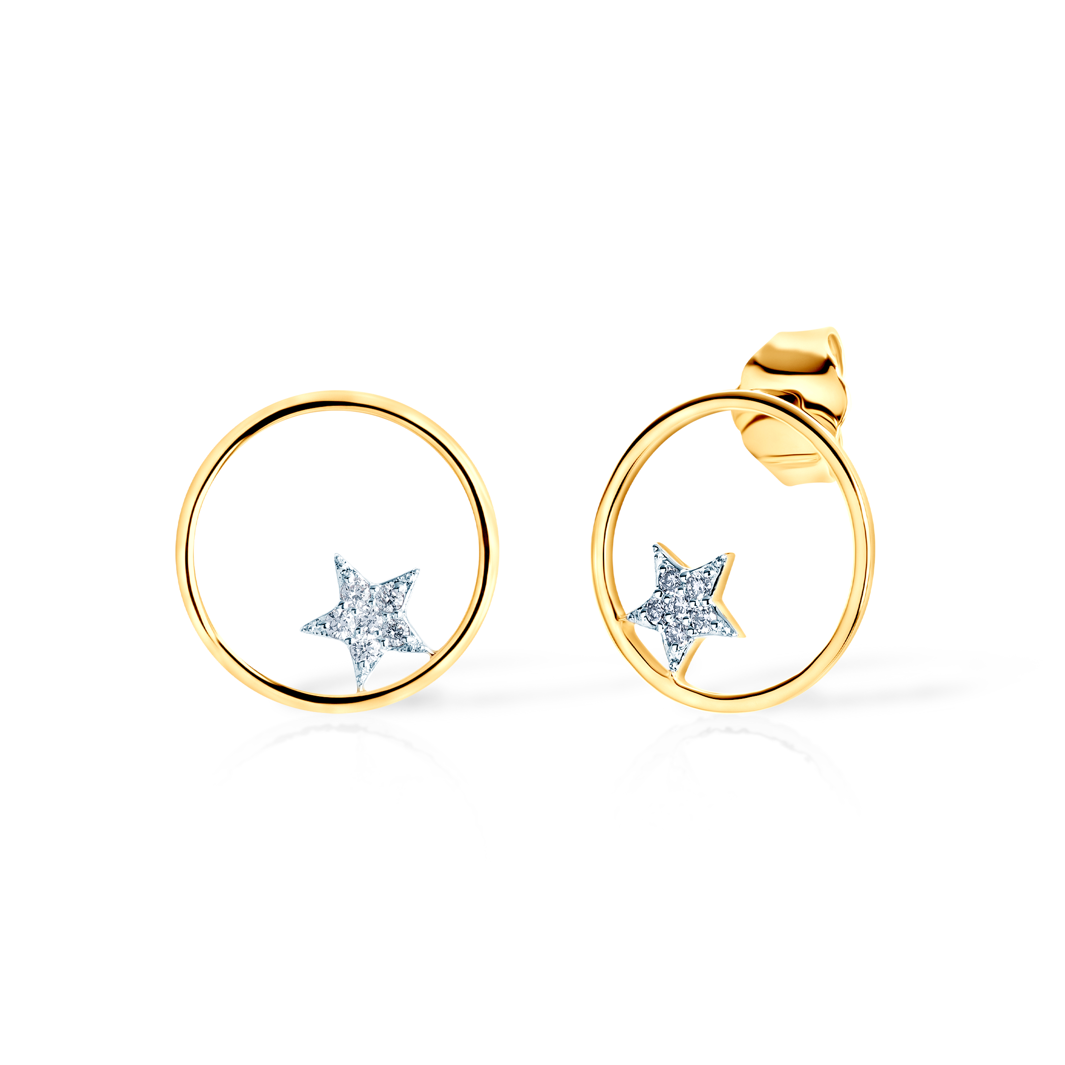 Kolczyki koła, gwiazdki Savicki wykonane żółtego złota (próba 375). W kolczykach zostało osadzonych 12 diamentów o łącznej masie 0,06 ct. Kolczyki posiadają blokadę, która zabezpiecza zapięcie przed zsunięciem się.