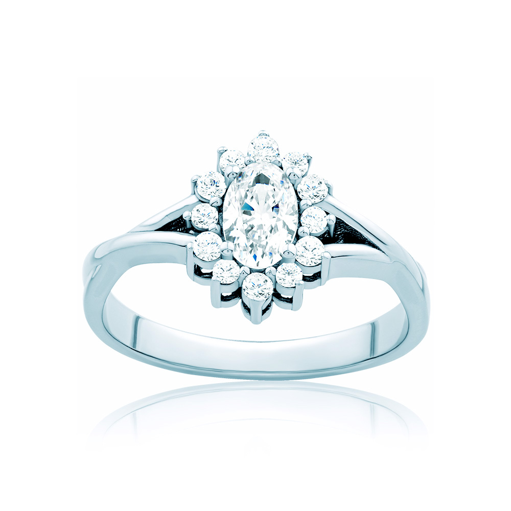 Pierścionek z 13 diamentami wysokiej czystości SI/H (centralny o masie 0,43 ct o szlifie owalnym oraz boczne o łącznej masie 0,30 ct o szlifie brylantowym). Wykonany z 14-karatowego białego złota (próba 0,585).