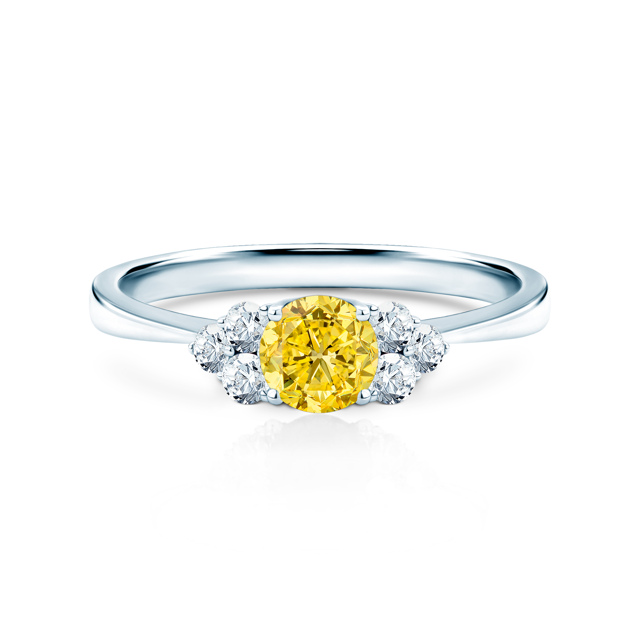 Ten olśniewający pierścionek zaręczynowy z żółtym szafirem o szlifie brylantowym i masie 0,30 ct oraz otaczającymi go sześcioma białymi szafirami, wykonany został z 14-karatowego białego złota próby 0,585.