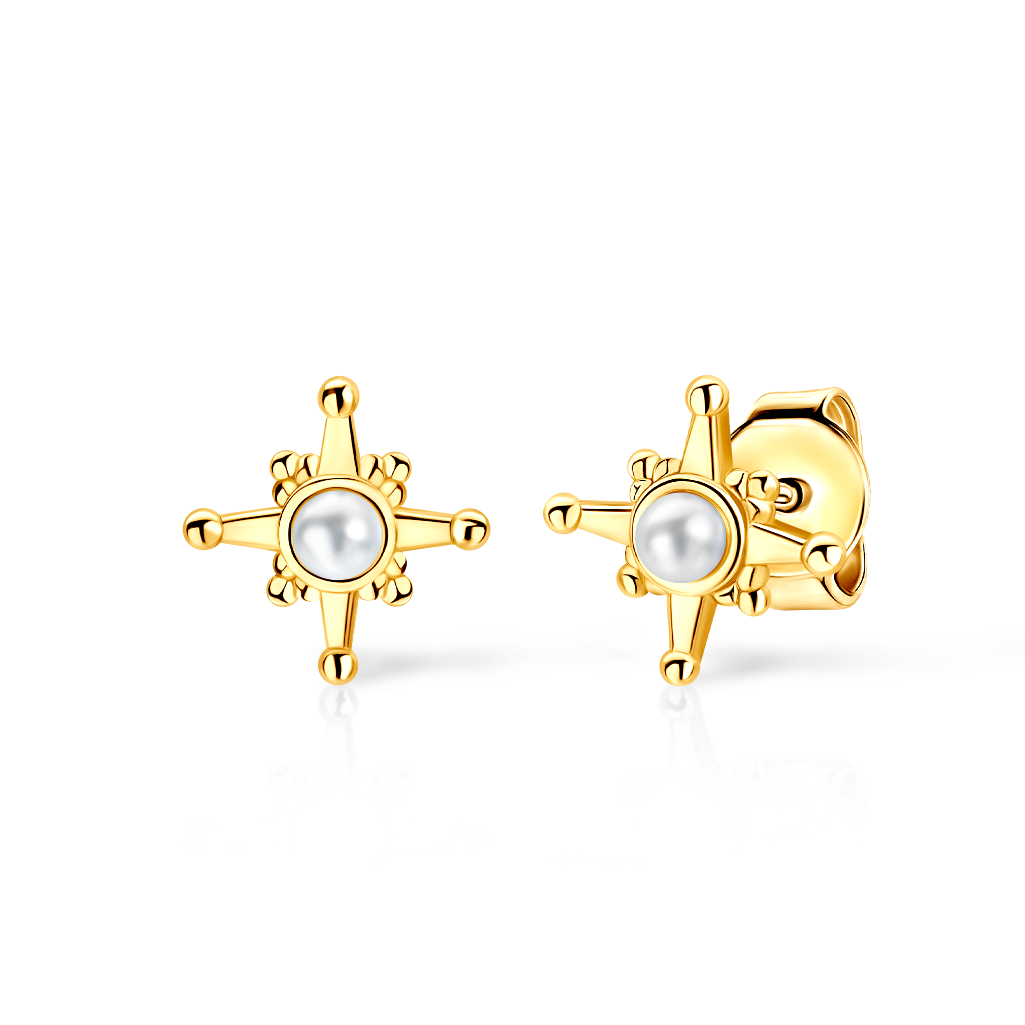Kolczyki gwiazdy Savicki wykonane ze srebra, pozłacane żółtym złotem. W kolczykach zostały osadzone 2 perły.