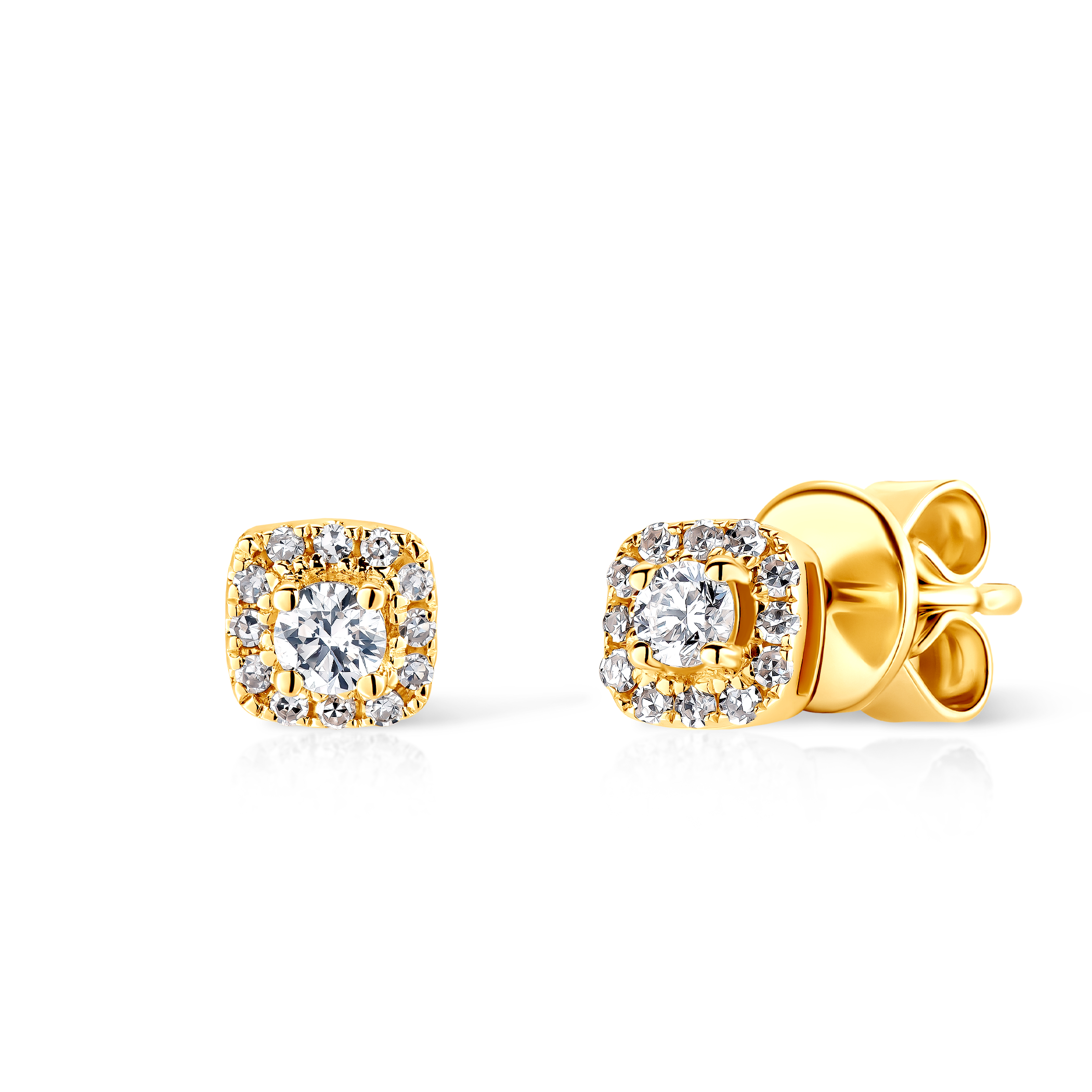 Kolczyki Savicki wykonane z żółtego złota (próba 585). W kolczykach zostało osadzonych 26 diamentów o szlifie single cut o łącznej masie 0,1 ct. Kolczyki posiadają blokadę, która zabezpiecza zapięcie przed zsunięciem się.