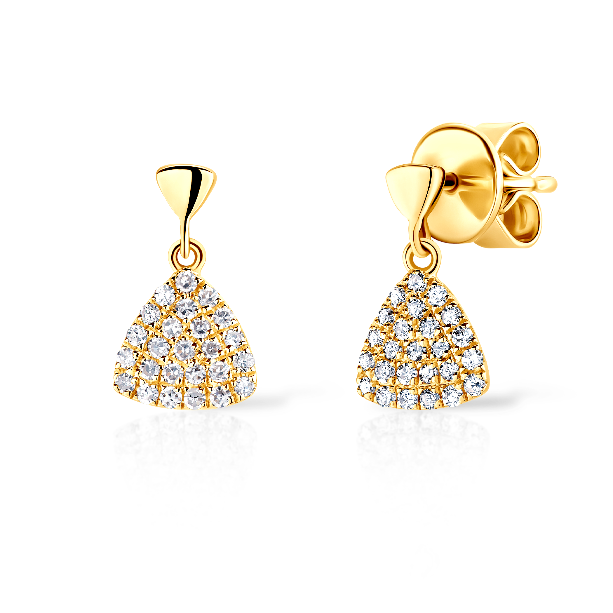 Kolczyki Savicki wykonane z żółtego złota (próba 585). W kolczykach zostało osadzonych 50 diamentów o szlifie single cut o łącznej masie 0,14 ct. Kolczyki posiadają blokadę, która zabezpiecza zapięcie przed zsunięciem się.