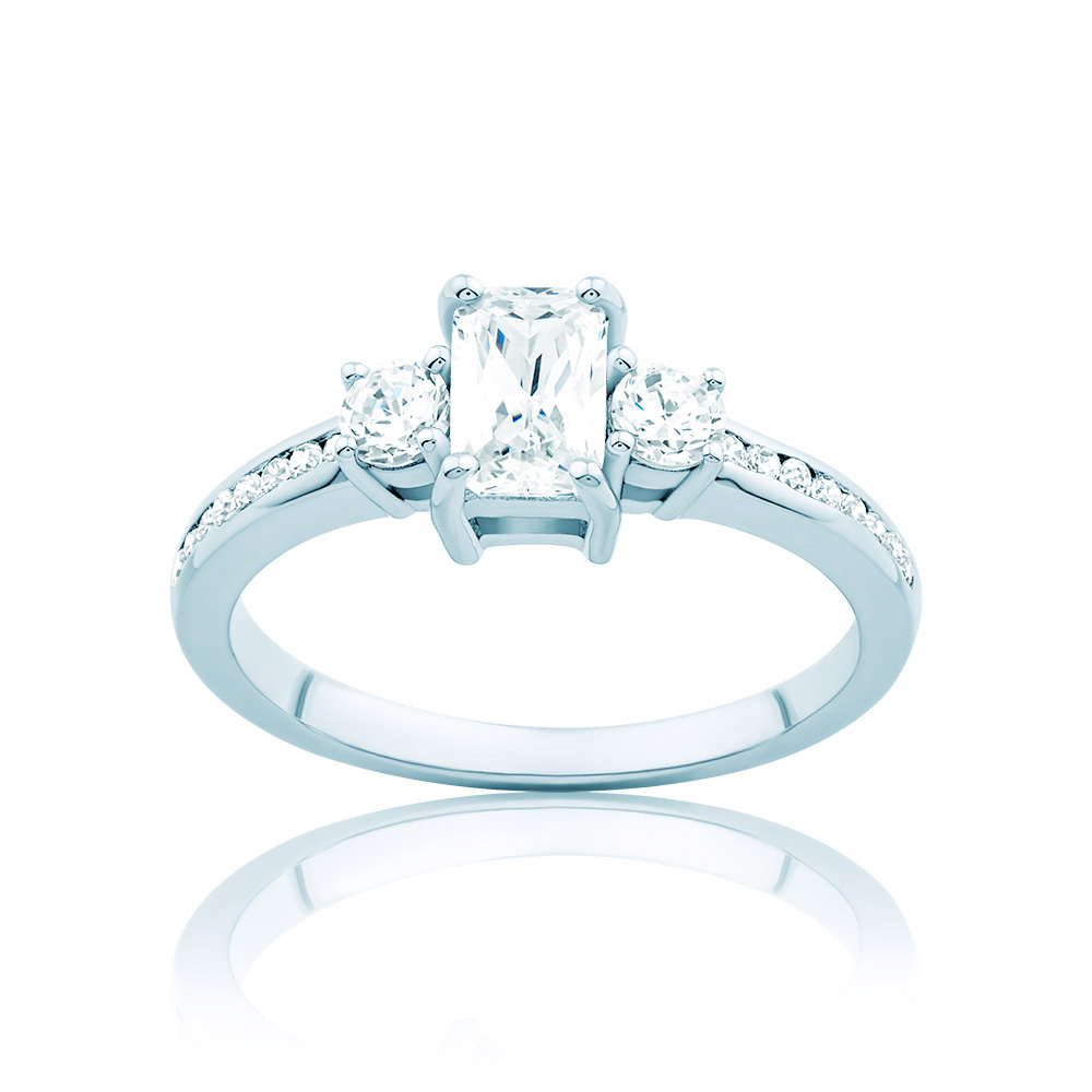 Pierścionek zaręczynowy z diamentami o łącznej masie 0,78 ct (centralny 0,50 ct o szlifie szmaragdowym, 2 diamenty o masie 0,10 ct o szlifie brylantowym oraz boczne o łącznej masie 0,08 ct). Pierścionek wysokiej czystości SI/H, wykonany z 14-karatowego białego złota (8róba 0,585).