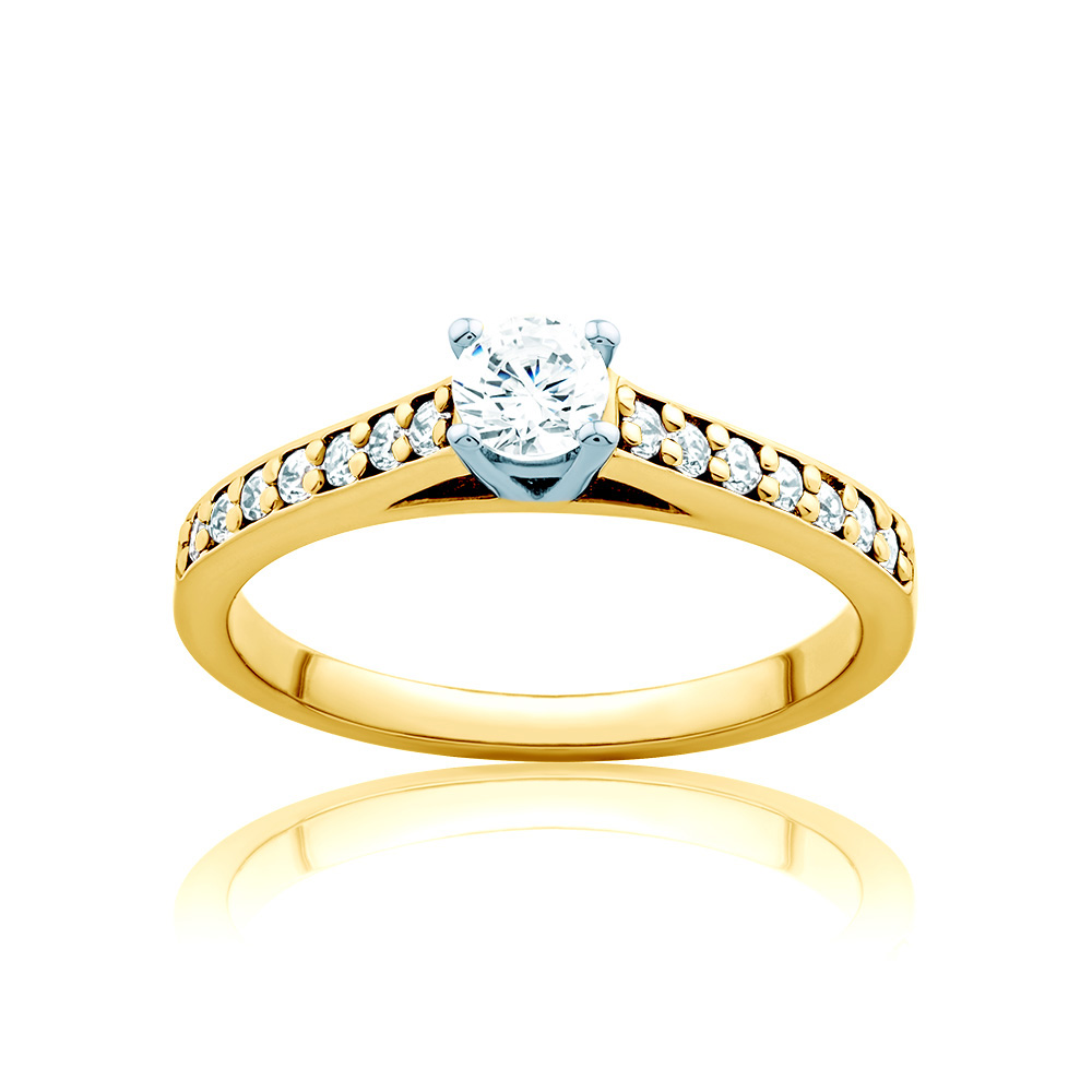 Pierścionek zaręczynowy z diamentami o szlifie brylantowym wysokiej czystości SI/H, o łącznej masie 0,46 ct (centralny 0,25 ct oraz 14 bocznych o masie 0,015 ct). Wykonany z połączenia 14-karatowego żółtego oraz białego złota (próba 0,585).