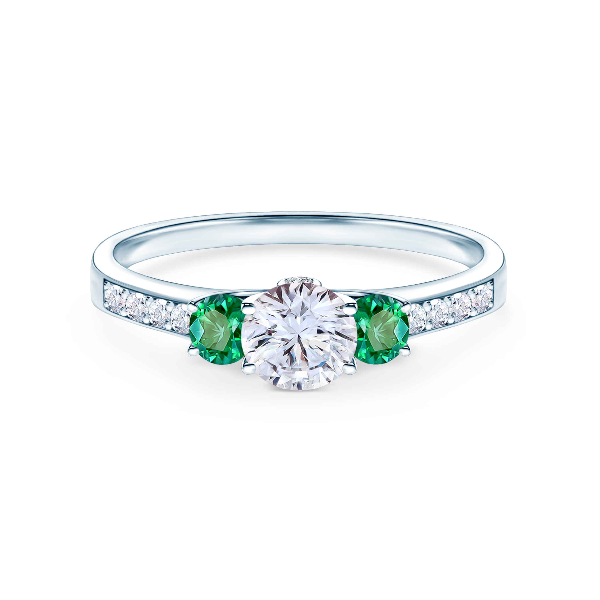 Pierścionek zaręczynowy z centralnie umieszczonym białym szafirem o masie 0,3 ct oraz dwoma szmaragdami o łącznej masie 0,2 ct. Boczne diamenty posiadają łączną masę 0,104 ct o wysokiej czystości SI/H i szlifie brylantowym. Wykonany z 14-karatowego białego złota (próba 585).