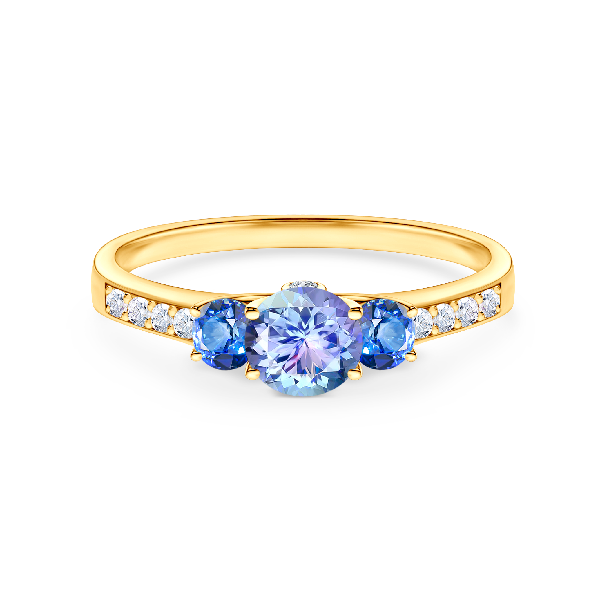Pierścionek zaręczynowy z centralnie umieszczonym tanzanitem o masie 0,3 ct oraz dwoma niebieskimi szafirami o łącznej masie 0,2 ct. Boczne diamenty posiadają łączną masę 0,126 ct o wysokiej czystości SI/H i szlifie brylantowym. Wykonany z 14-karatowego żółtego złota (próba 585).