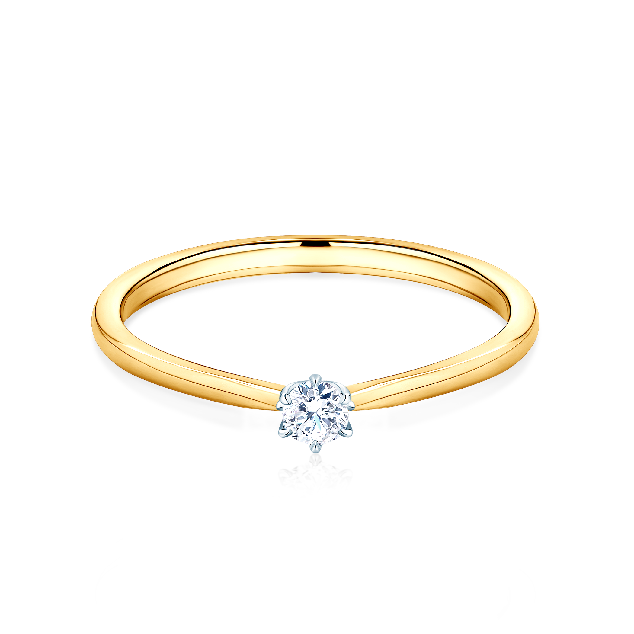 Pierścionek zaręczynowy z diamentem o masie 0,09 ct, szlifie brylantowym oraz wysokiej czystości SI2/H. Wykonany z połączenia 14-karatowego żółtego i białego złota (próba 585).