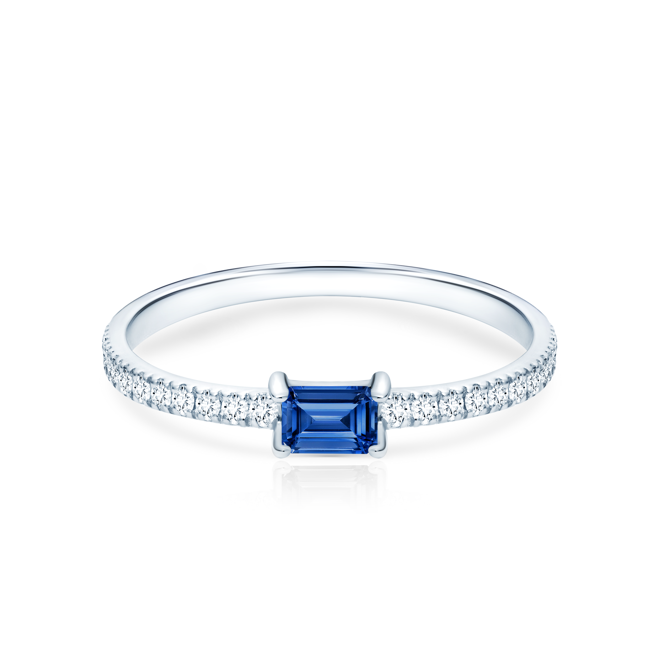 Pierścionek zaręczynowy z centralnie umieszczonym niebieskim szafirem o masie 0,15 ct o szlifie szmaragdowym oraz z 26 diamentami o łącznej masie 0,12 ct, szlifie brylantowym, wysokiej czystości i kolorze SI/H. Wykonany z 14-karatowego białego złota (próba 585).