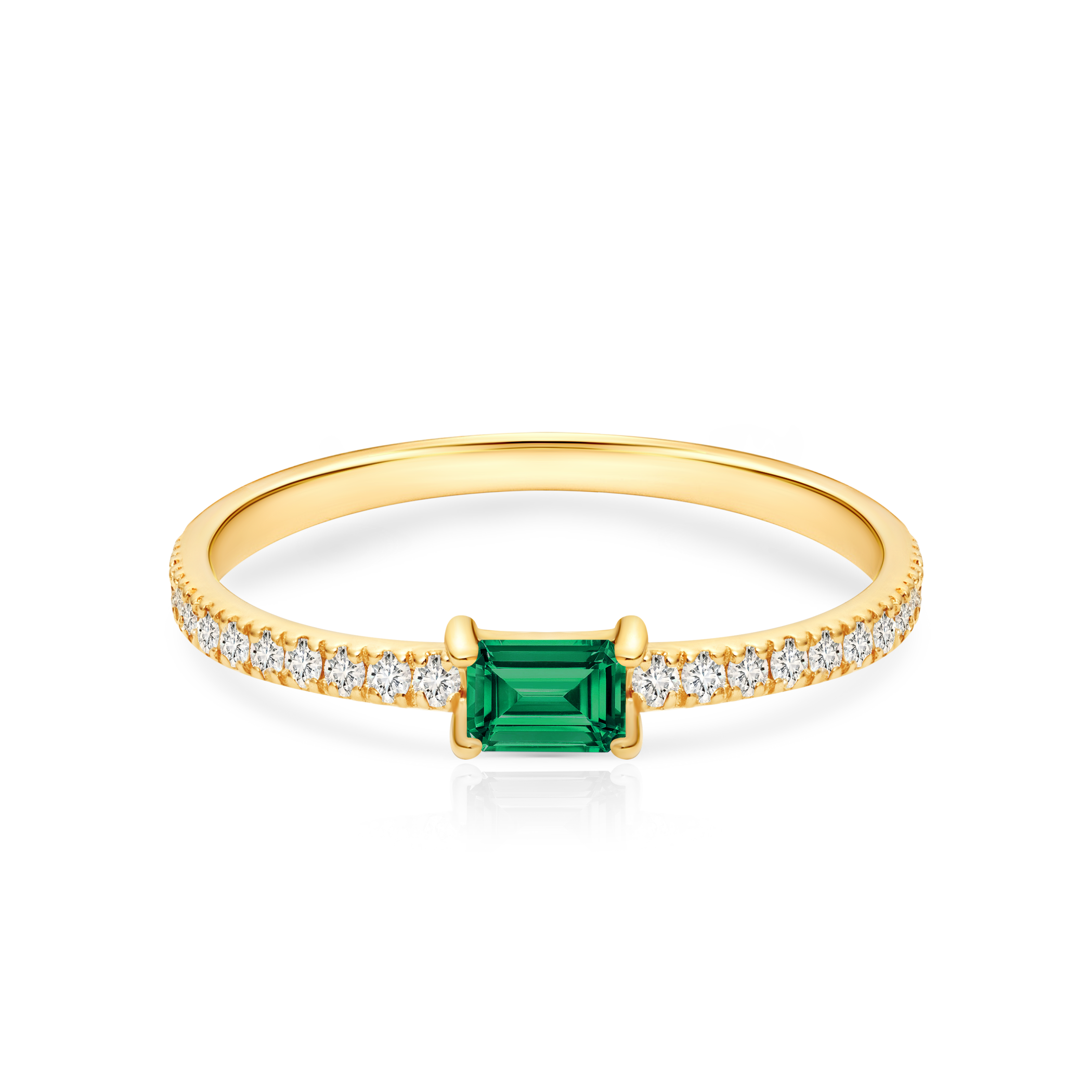 Pierścionek zaręczynowy z centralnie umieszczonym szmaragdem o masie 0,13 ct o szlifie szmaragdowym oraz z 26 diamentami o łącznej masie 0,12 ct, szlifie brylantowym, wysokiej czystości i kolorze SI/H. Wykonany z 14-karatowego żółtego złota (próba 585).