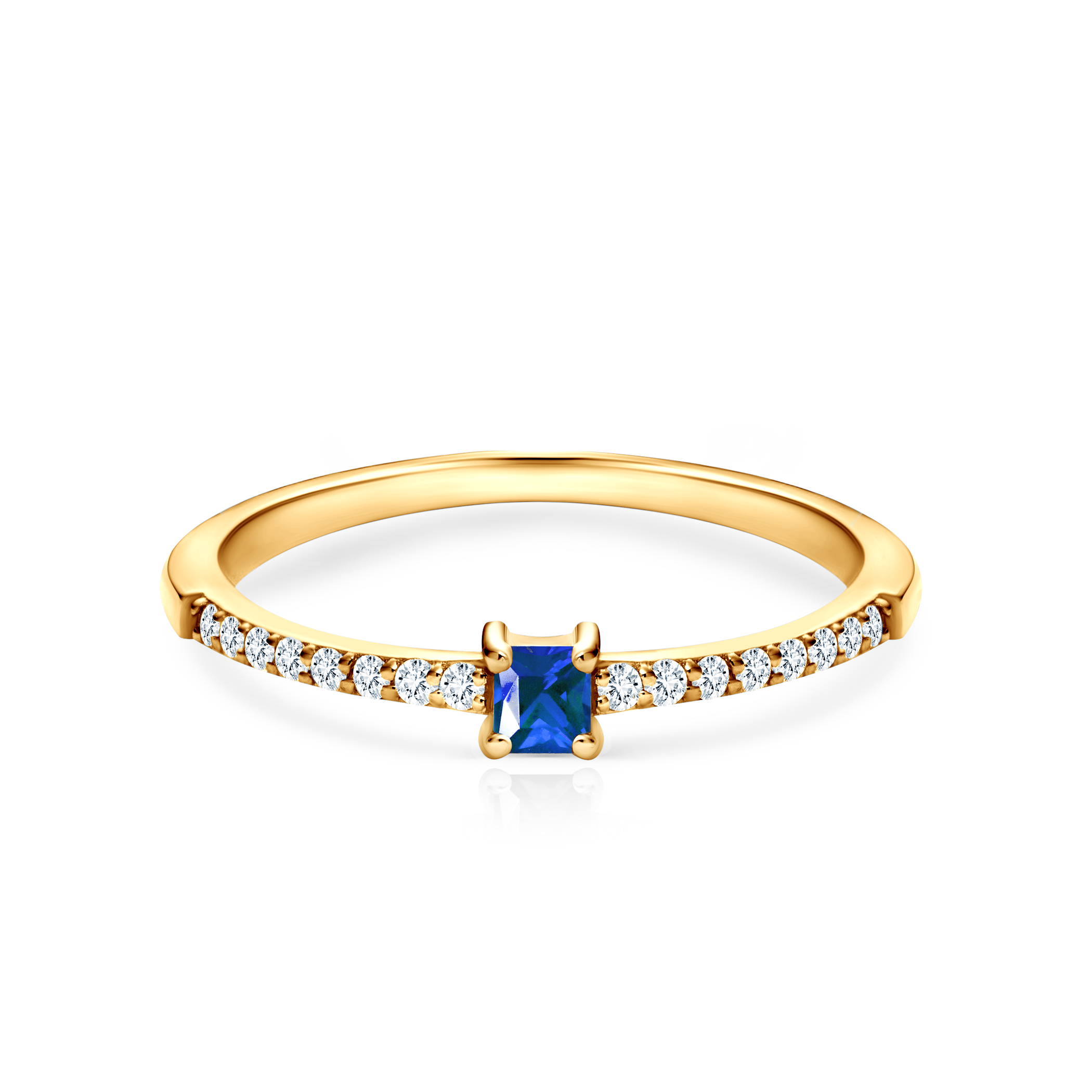 Pierścionek zaręczynowy z centralnie umieszczonym niebieskim szafirem o masie 0,1 ct, szlifie princessa oraz z 16 diamentami o łącznej masie 0,1 ct, szlifie brylantowym, wysokiej czystości i kolorze SI/H. Wykonany z 14-karatowego żółtego złota (próba 585).