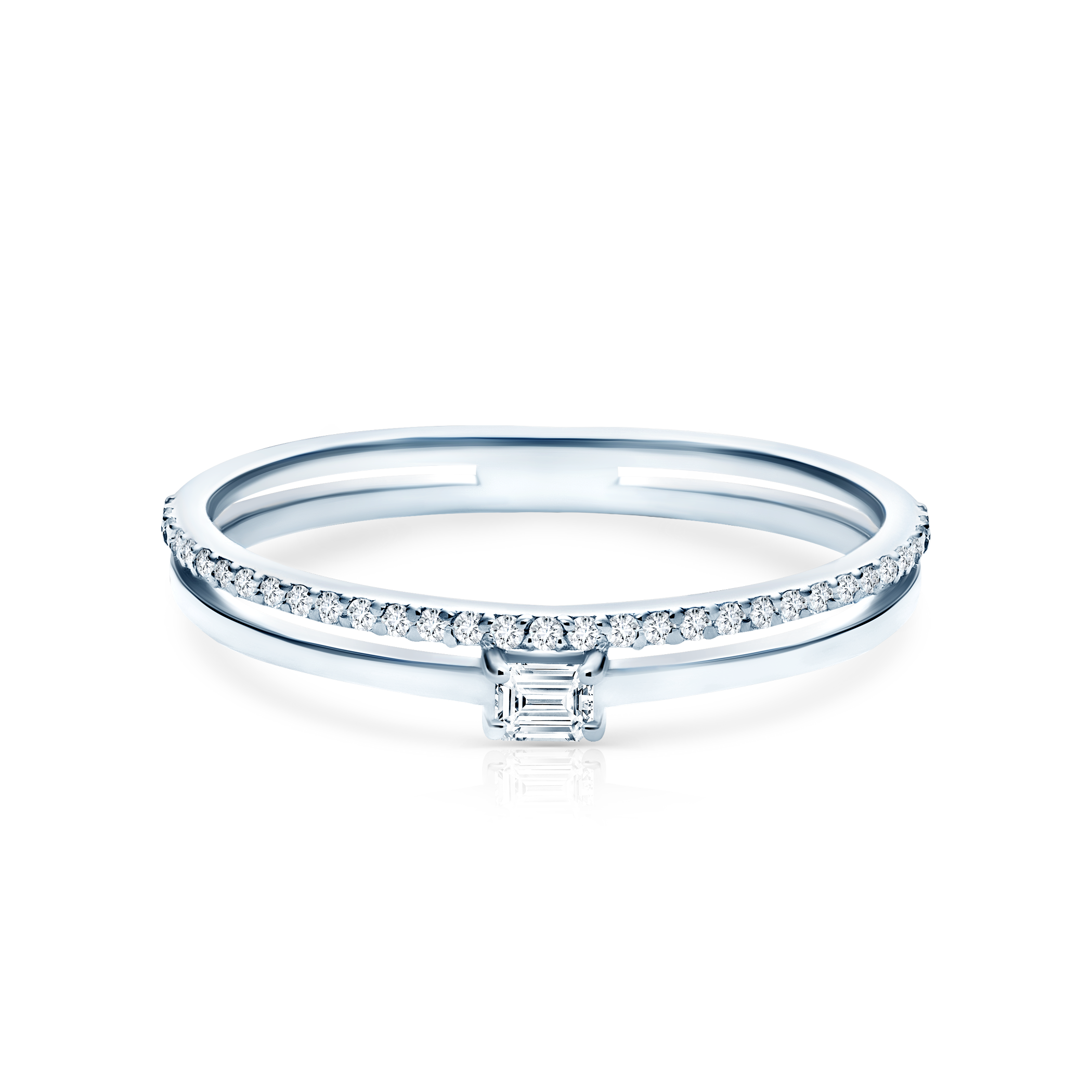 Pierścionek zaręczynowy z centralnie umieszczonym diamentem o masie 0,04 ct o szlifie bagietka oraz z 33 diamentami o łącznej masie 0,08 ct, szlifie brylantowym, wysokiej czystości i kolorze SI/H. Wykonany z 14-karatowego białego złota (próba 585).