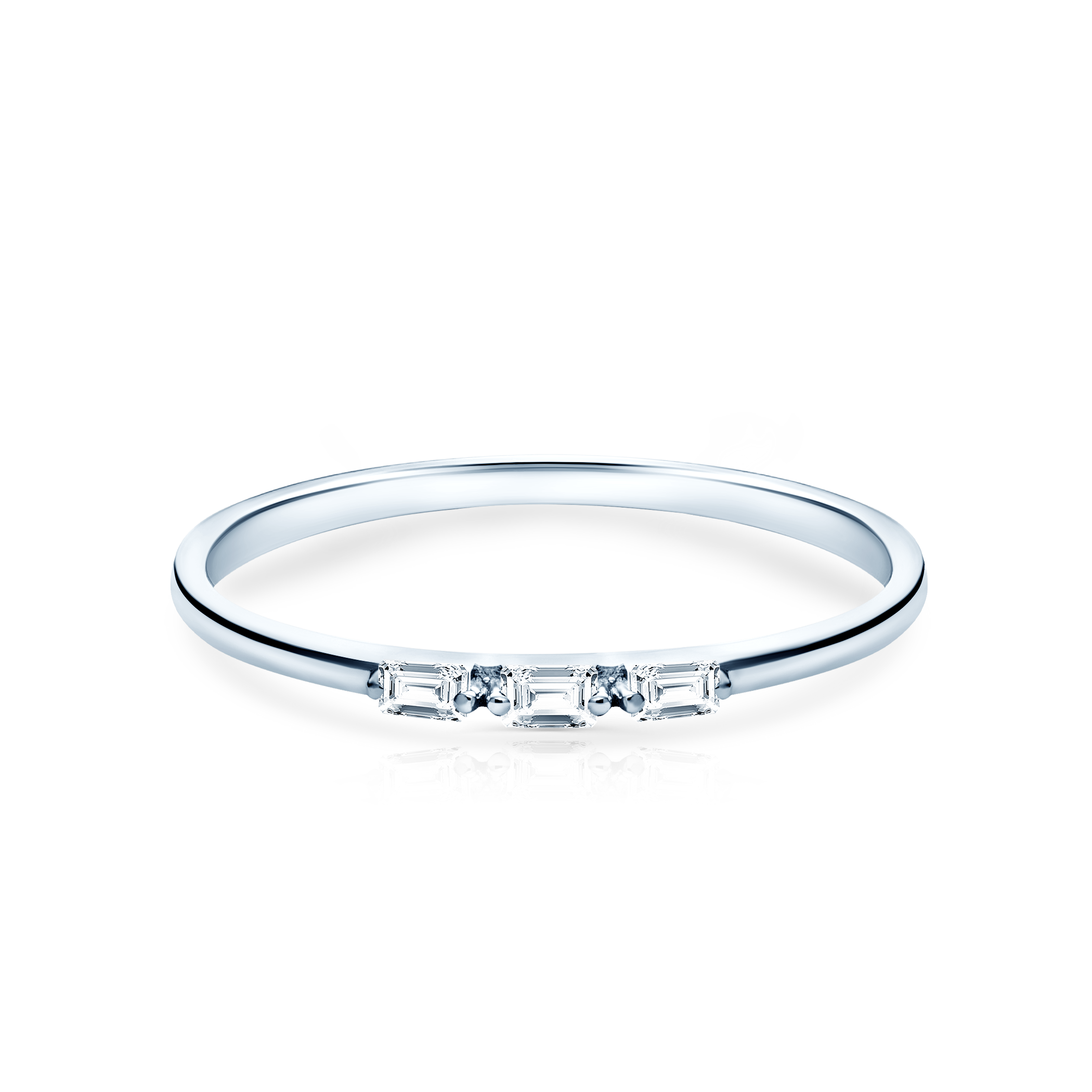 Pierścionek zaręczynowy z centralnie umieszczonymi 3 diamentami o łącznej masie 0,07 ct, szlifie bagietka, wysokiej czystości i kolorze SI/H. Wykonany z 14-karatowego białego złota (próba 585).