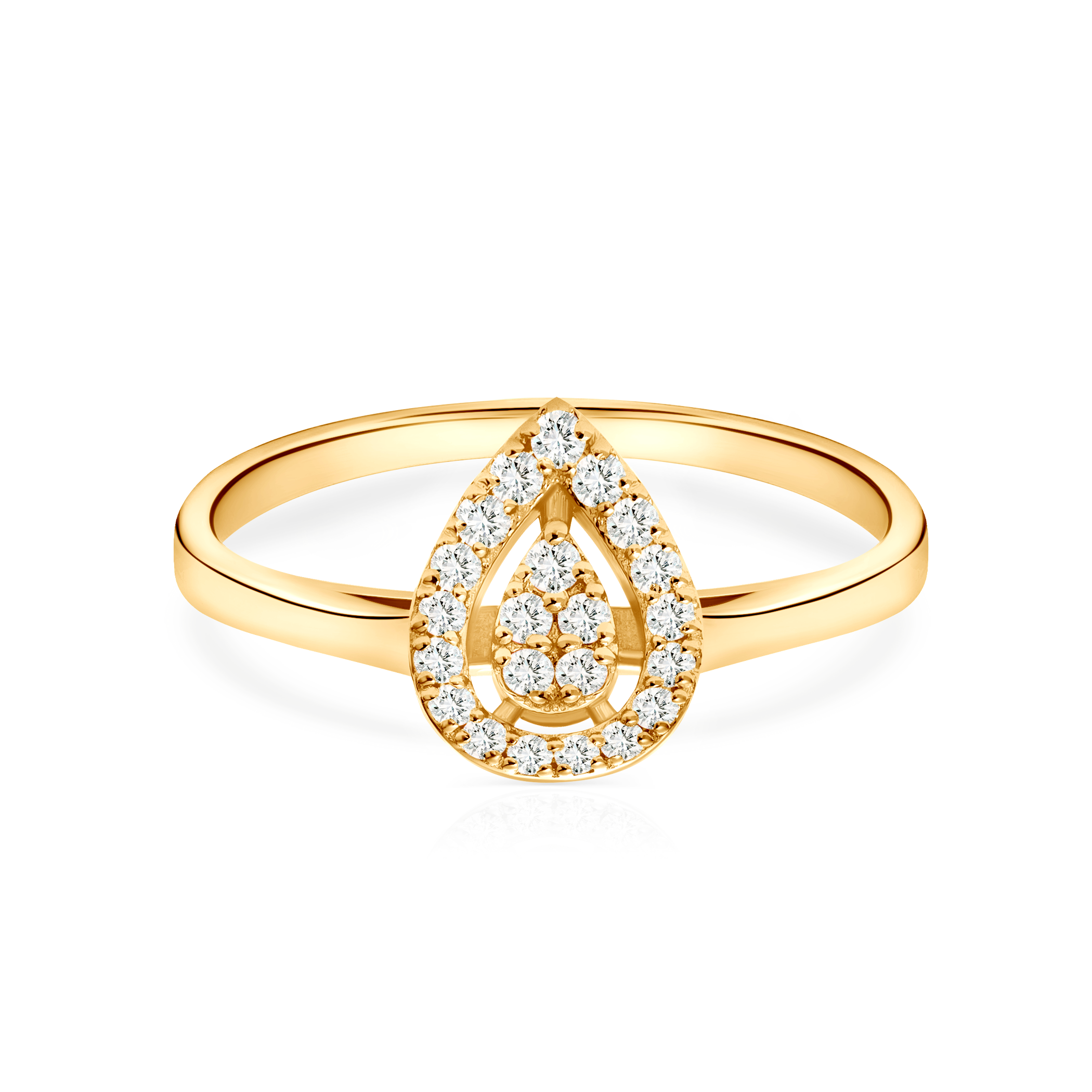 Pierścionek zaręczynowy z centralnie umieszczonymi 5 diamentami o łącznej masie 0,03 ct, szlifie brylantowym, wysokiej czystości i kolorze SI/H oraz z 17 diamentami o łącznej masie 0,10 ct szlifie brylantowym, wysokiej czystości i kolorze SI/H. Wykonany z 14-karatowego żółtego złota (próba 585).