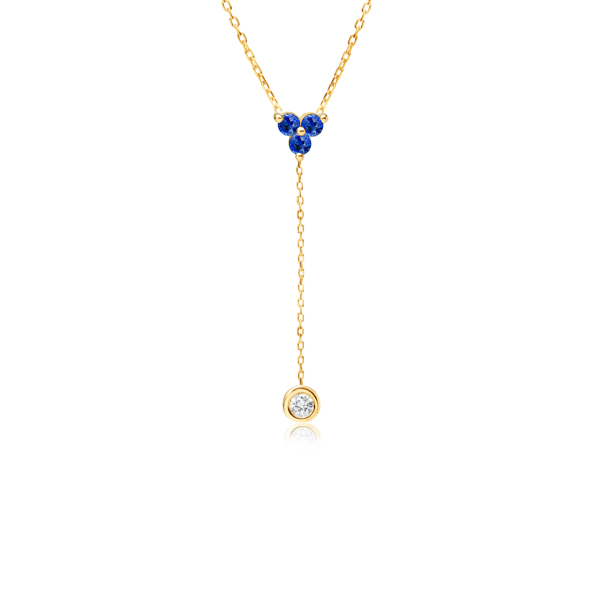 Naszyjnik Savicki wykonany z żółtego złota (próba 585). W naszyjniku zostały osadzone 3 niebieskie szafiry o łącznej masie 0,14 ct oraz 1 diament masie 0,06 ct.