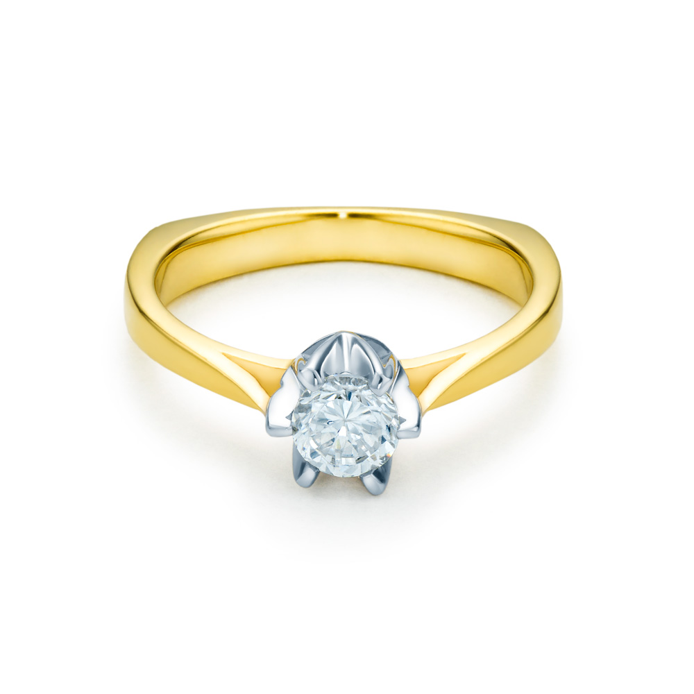Pierścionek z diamentem o masie 0,25 ct, o szlifie brylantowym wysokiej czystości SI/H. Wykonany z połączenia 14-karatowego żółtego oraz białego złota (próba 0,585).