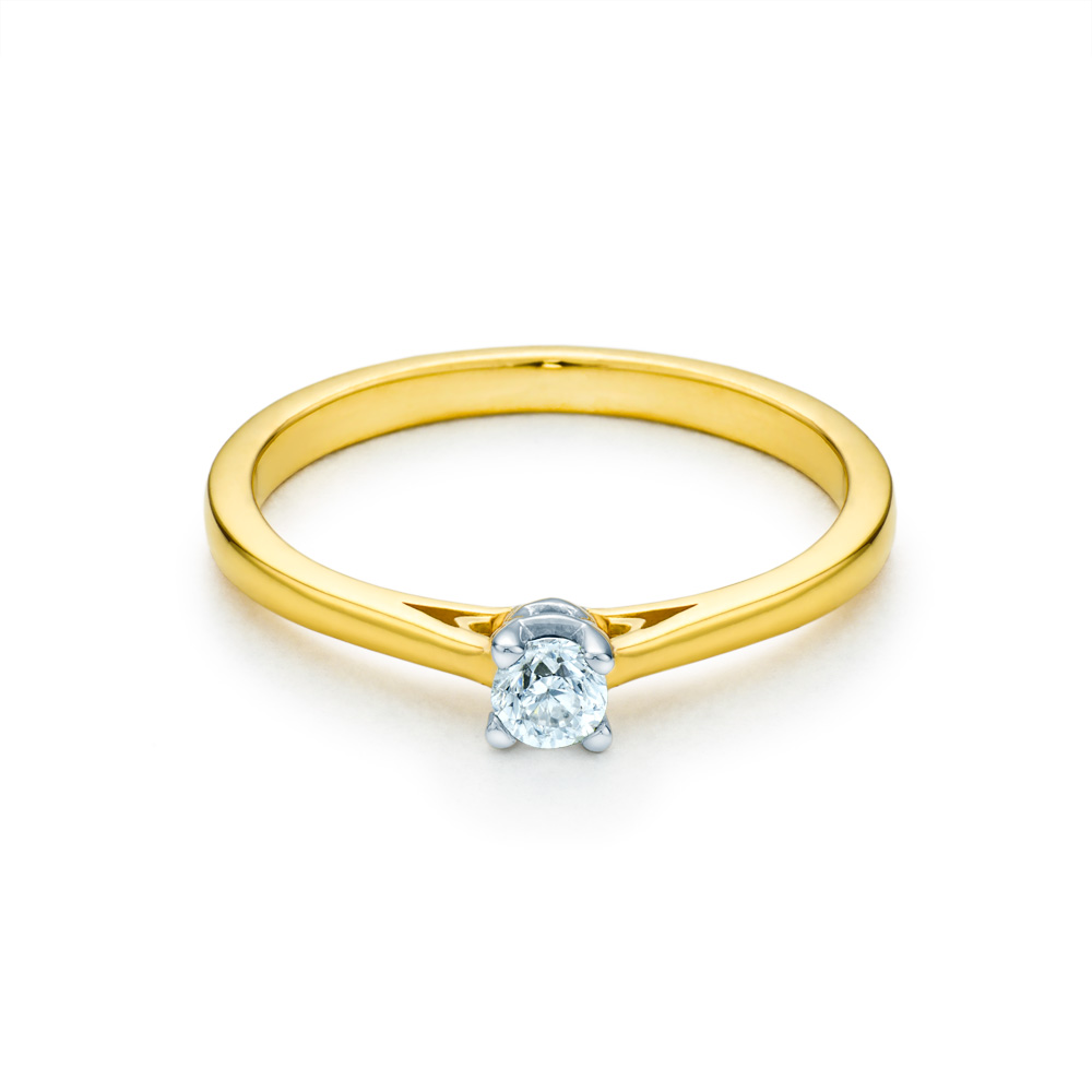 Pierścionek zaręczynowy z diamentem o masie 0,14 ct, o szlifie brylantowym wysokiej czystości SI/H. Wykonany z połączenia 14-karatowego żółtego oraz białego złota (próba 0,585).