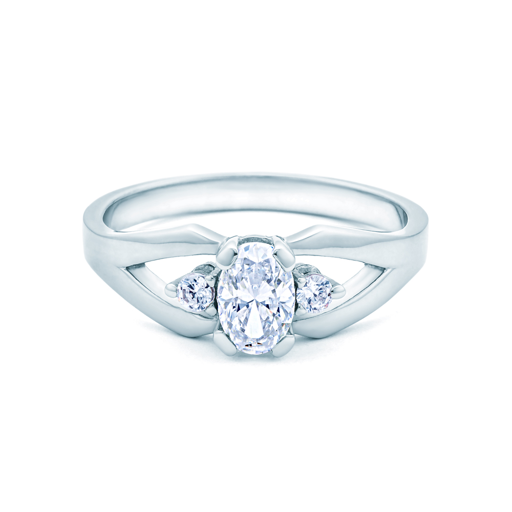 Pierścionek z diamentem wysokiej czystości SI/H o łącznej masie 0,55 ct (centralny 0,48 ct o szlifie owalnym oraz 2 boczne o masie 0,07 ct, o szlifie brylantowym). Wykonany z 14-karatowego białego złota (próba 0,585).