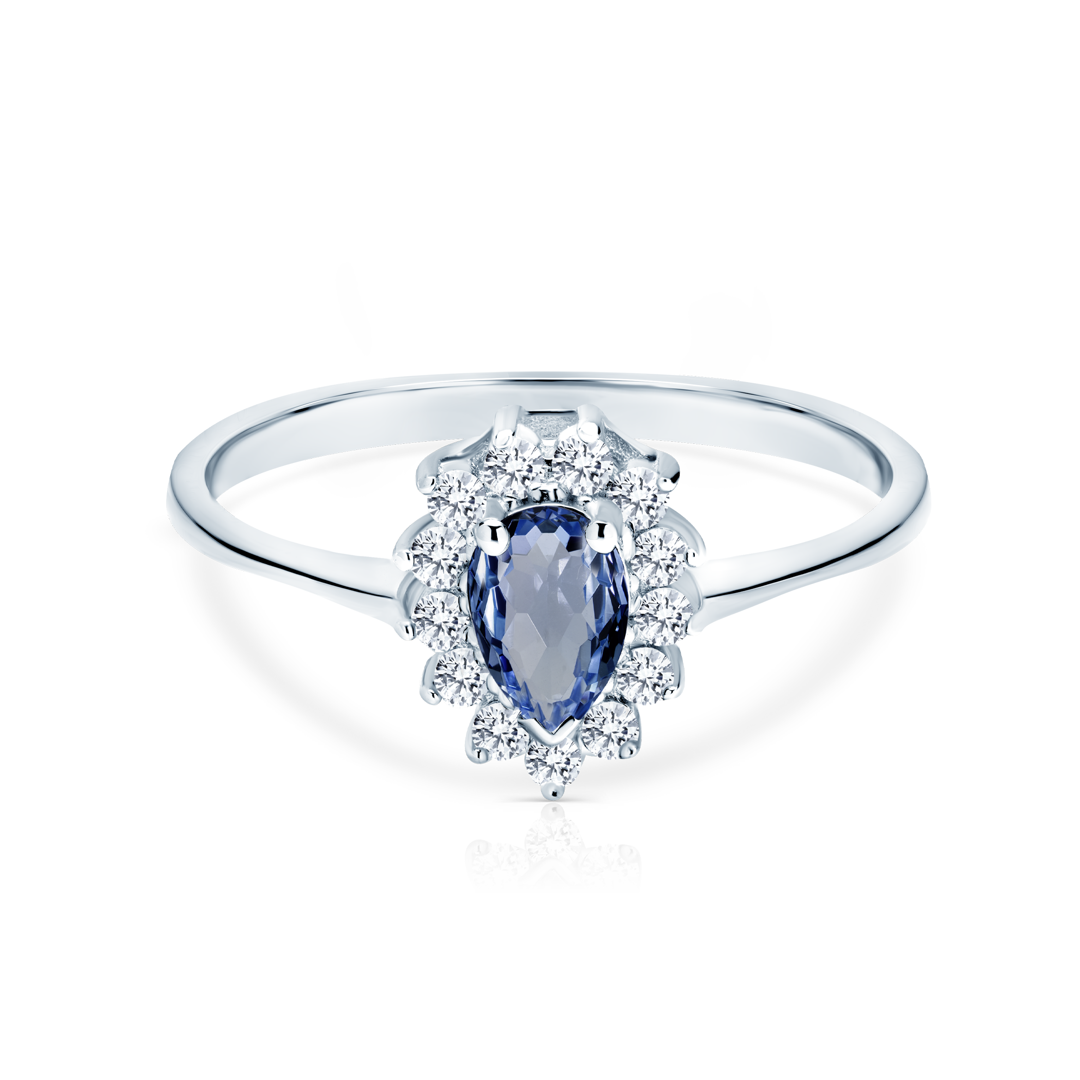 Pierścionek zaręczynowy z centralnie umieszczonym niebieskim szafirem o masie 0,36 ct, szlifie łezka oraz z 13 diamentami o łącznej masie 0,156 ct, szlifie brylantowym, wysokiej czystości i kolorze SI/H. Wykonany z 14-karatowego białego złota (próba 585).