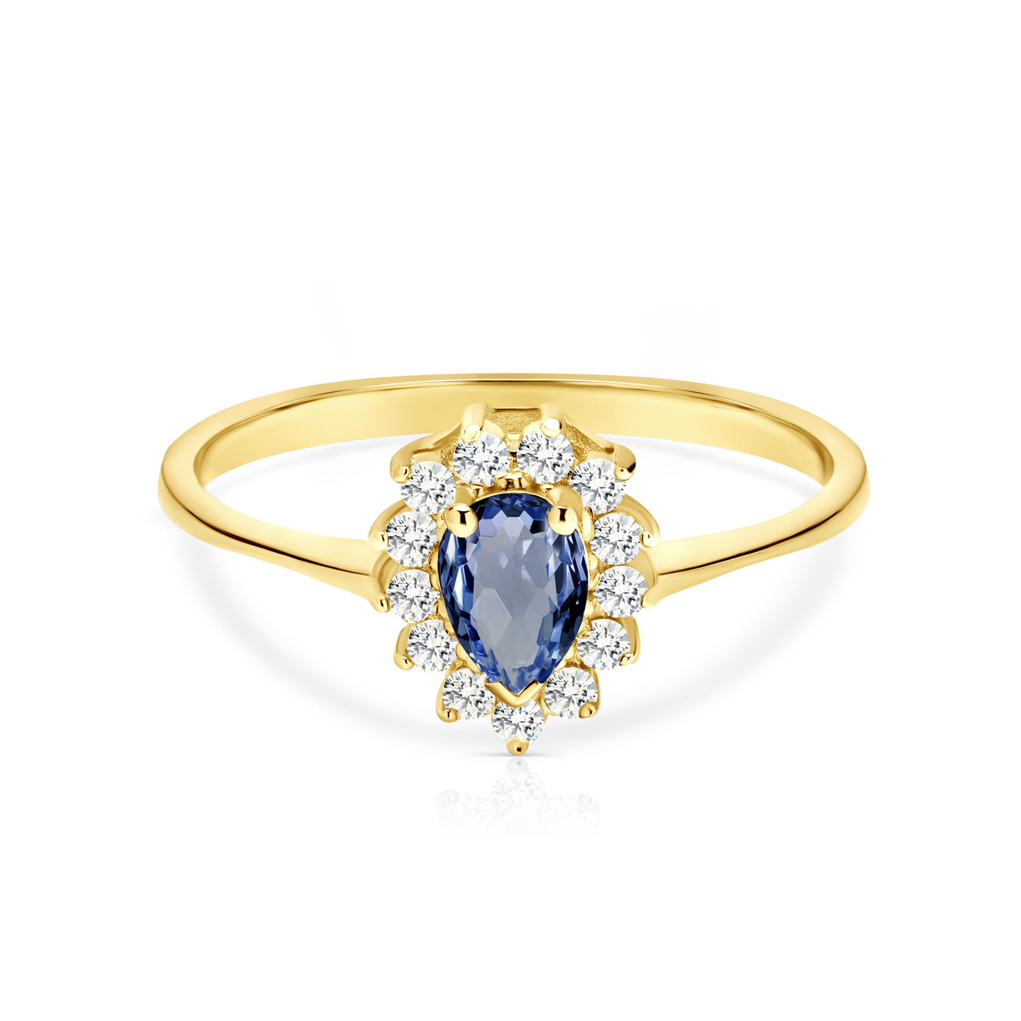 Pierścionek zaręczynowy z centralnie umieszczonym niebieskim szafirem o masie 0,36 ct, szlifie łezka oraz z 13 diamentami o łącznej masie 0,156 ct, szlifie brylantowym, wysokiej czystości i kolorze SI/H. Wykonany z 14-karatowego żółtego złota (próba 585).