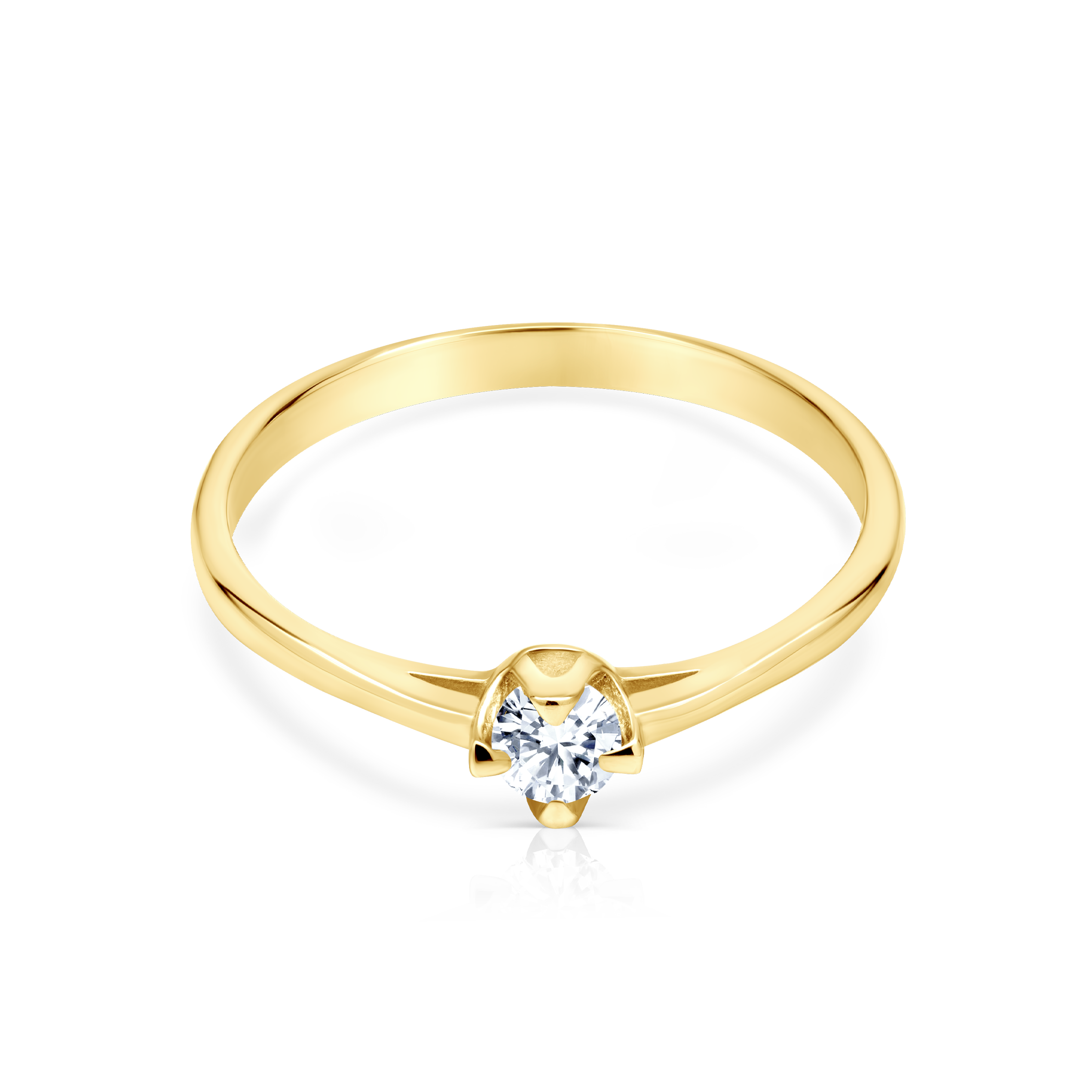 Pierścionek zaręczynowy z centralnie umieszczonym diamentem o masie 0,08 ct, szlifie brylantowym o wysokiej czystości i kolorze SI/H. Wykonany z 14-karatowego żółtego złota (próba 585).