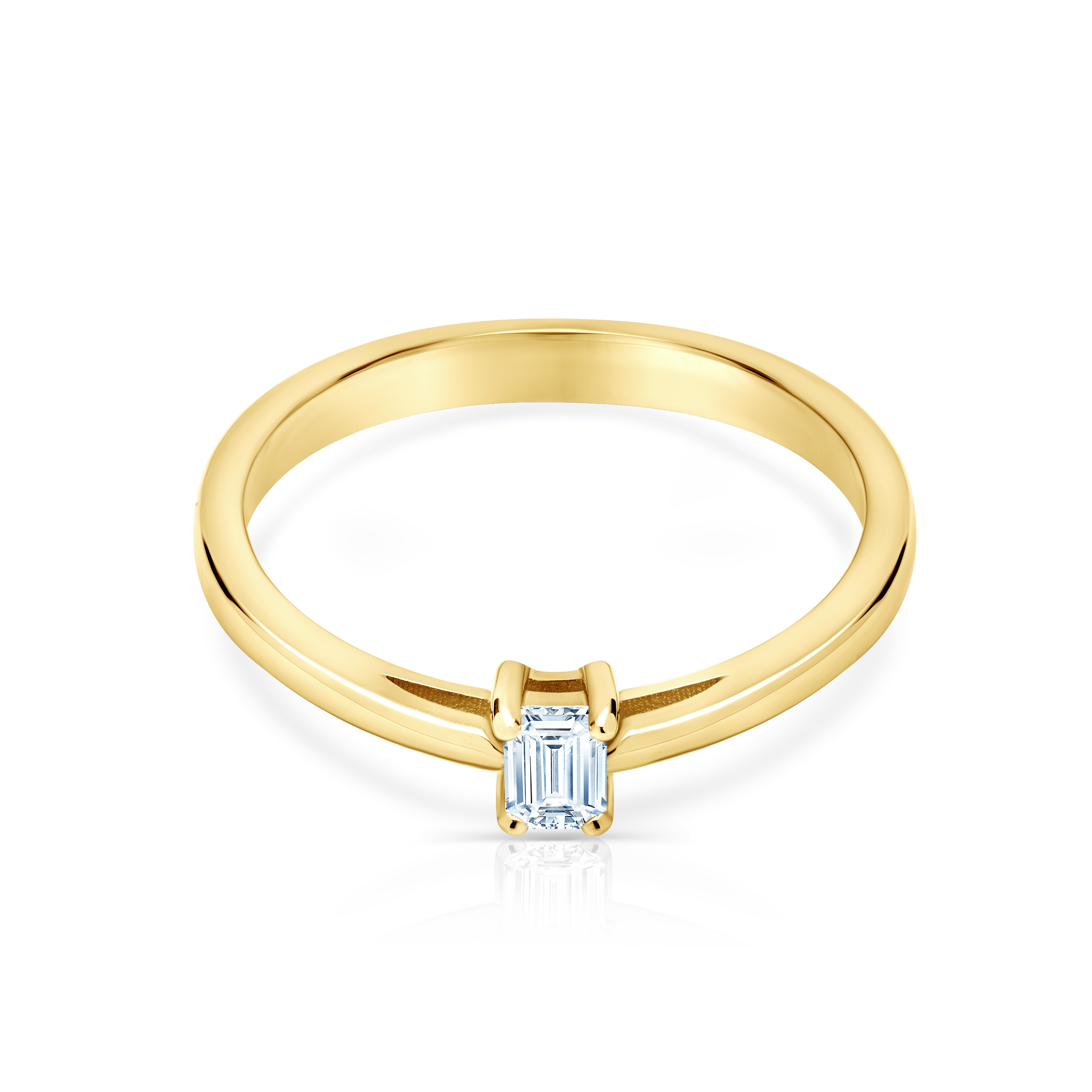 Pierścionek zaręczynowy z centralnie umieszczonym diamentem o masie 0,08 ct, szlifie szmaragdowy o wysokiej czystości i kolorze SI/H. Wykonany z 14-karatowego żółtego złota (próba 585).