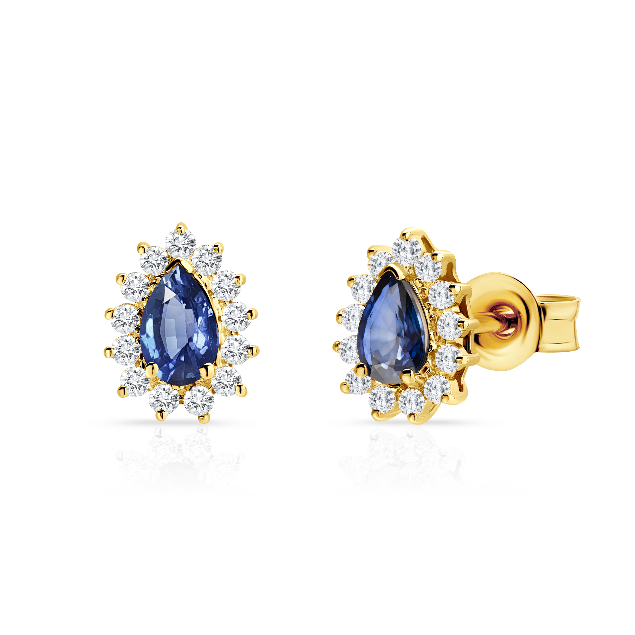 W kolczykach zostały osadzone 2 niebieskie szafiry o łącznej masie 0,75 ct oraz z 26 diamentami o łącznej masie 0,312 ct. Kolczyki Savicki wykonane z żółtego złota (próba 585).