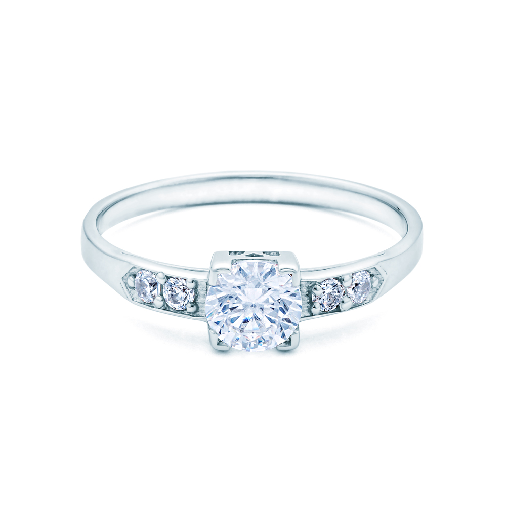 Pierścionek zaręczynowy z diamentami o szlifie brylantowym wysokiej czystości SI/H, o łącznej masie 0,48 ct (centralny 0,32 ct oraz 4 boczne o masie 0,04 ct). Wykonany z 14-karatowego białego złota (próba 0,585).