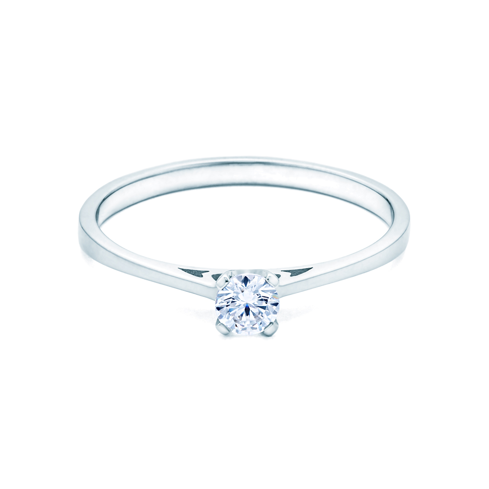 Pierścionek zaręczynowy z diamentem o masie 0,12 ct, o szlifie brylantowym wysokiej czystości SI/H, wykonany z 14-karatowego białego złota (próba 0,585).